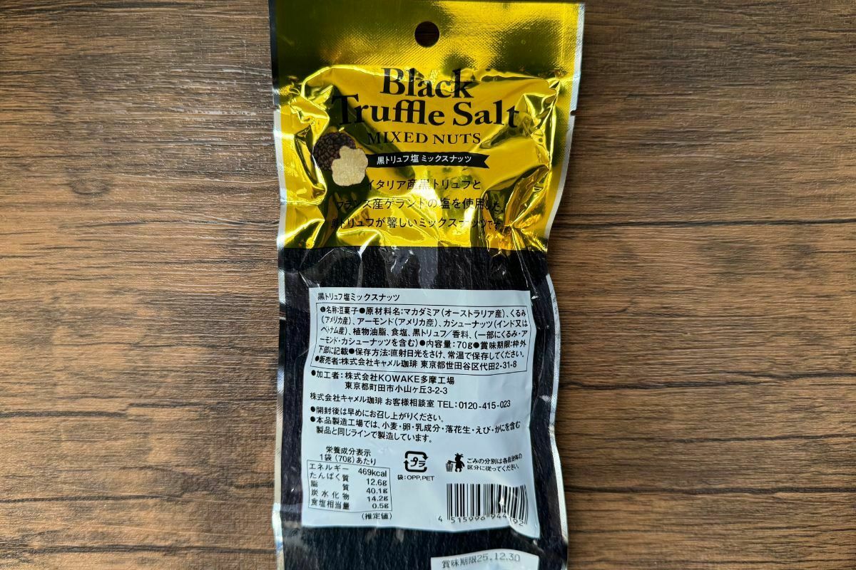イタリア産の黒トリュフとフランス産ゲランドの塩を使用した、香り高いミックスナッツです。