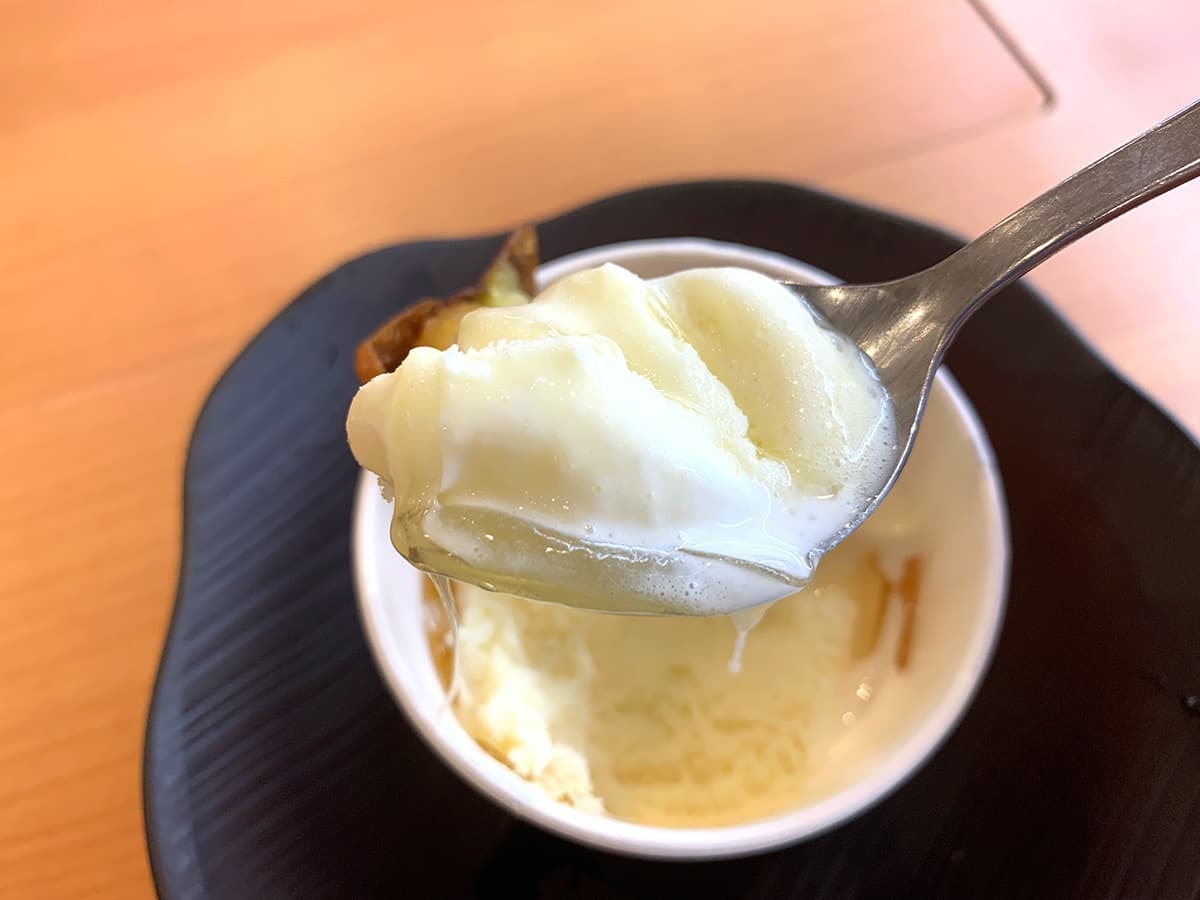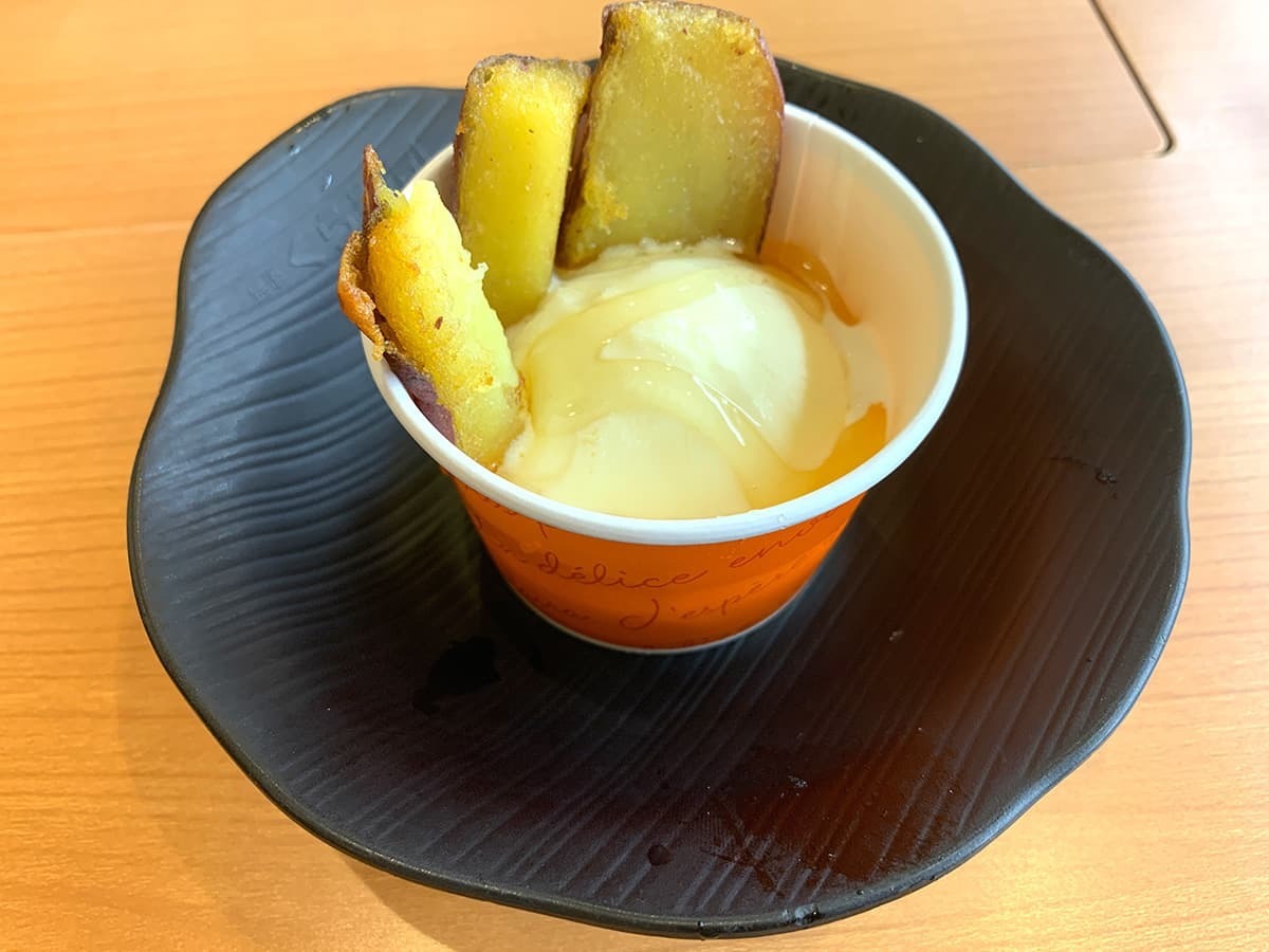まず、添えられているさつまいもから実食。揚げたてのため温かい状態で提供されるさつまいもで、アイスとの温冷のコントラストがクセになります。