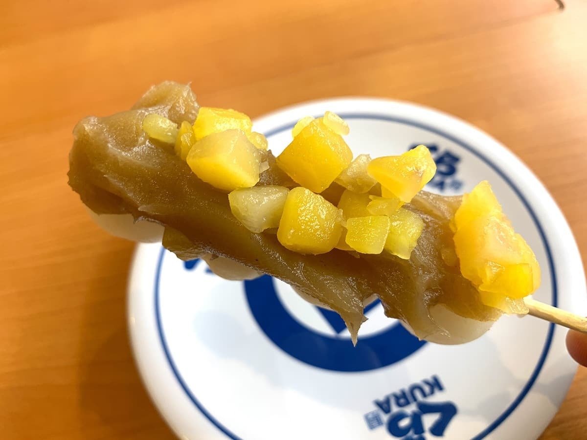 だんごの上に栗と餡がたっぷり乗せられた「くらだんご 和栗あん」をご紹介します。