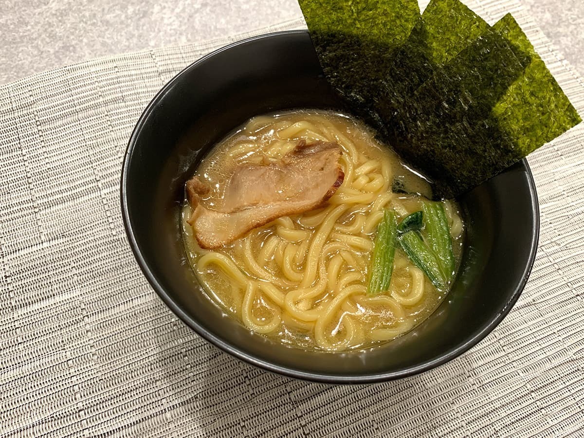 完成したラーメンを器に盛り付けてみました。麺はもちもち食感で美味しく、冷凍ラーメンだったと感じさせない仕上がり!