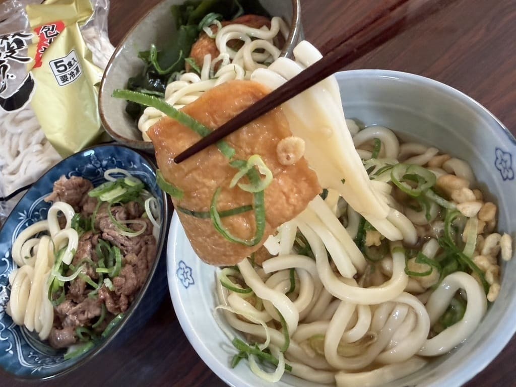 肉うどん、きつねうどん、わかめ&ごぼうあげうどんです。