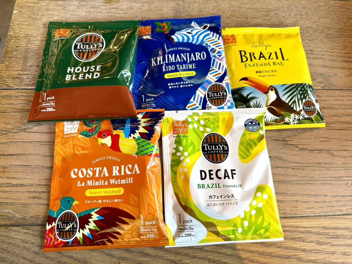5つのパックの中身はそれぞれ異なる種類のコーヒーで、タリーズのハウスブレンドからカフェインレスのものまで入っているので、家族で好みに合わせて選べます。