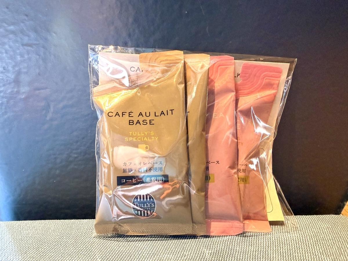袋の中には希釈用のコーヒーや紅茶の液体が入っており、それをミルクで割れば家で簡単に本格的なカフェオレやロイヤルミルクティーが作れるもの。