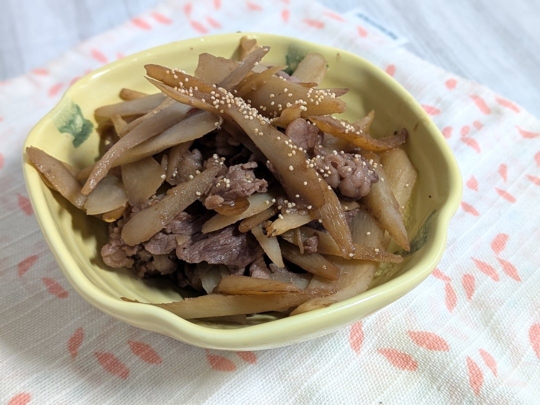 パッケージにある調理例を元に、ほぼ同じ材料と分量で「牛肉ごぼうきんぴら」を作りました。