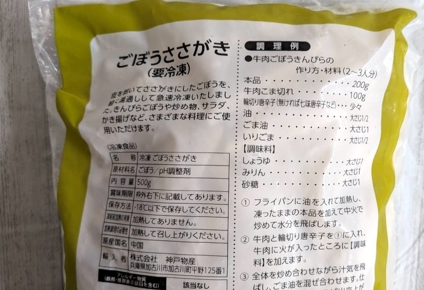 冷凍野菜のコーナーに「ごぼうささがき」が売られています。