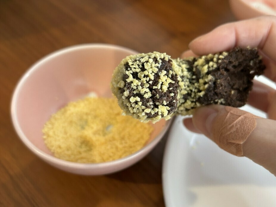 カットしたゴールデンチョコの断面にこのつぶつぶをたっぷり乗せる「追い粒(おいツブ)」にも挑戦してみました。