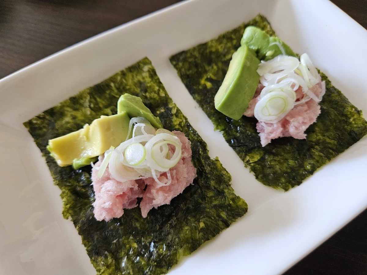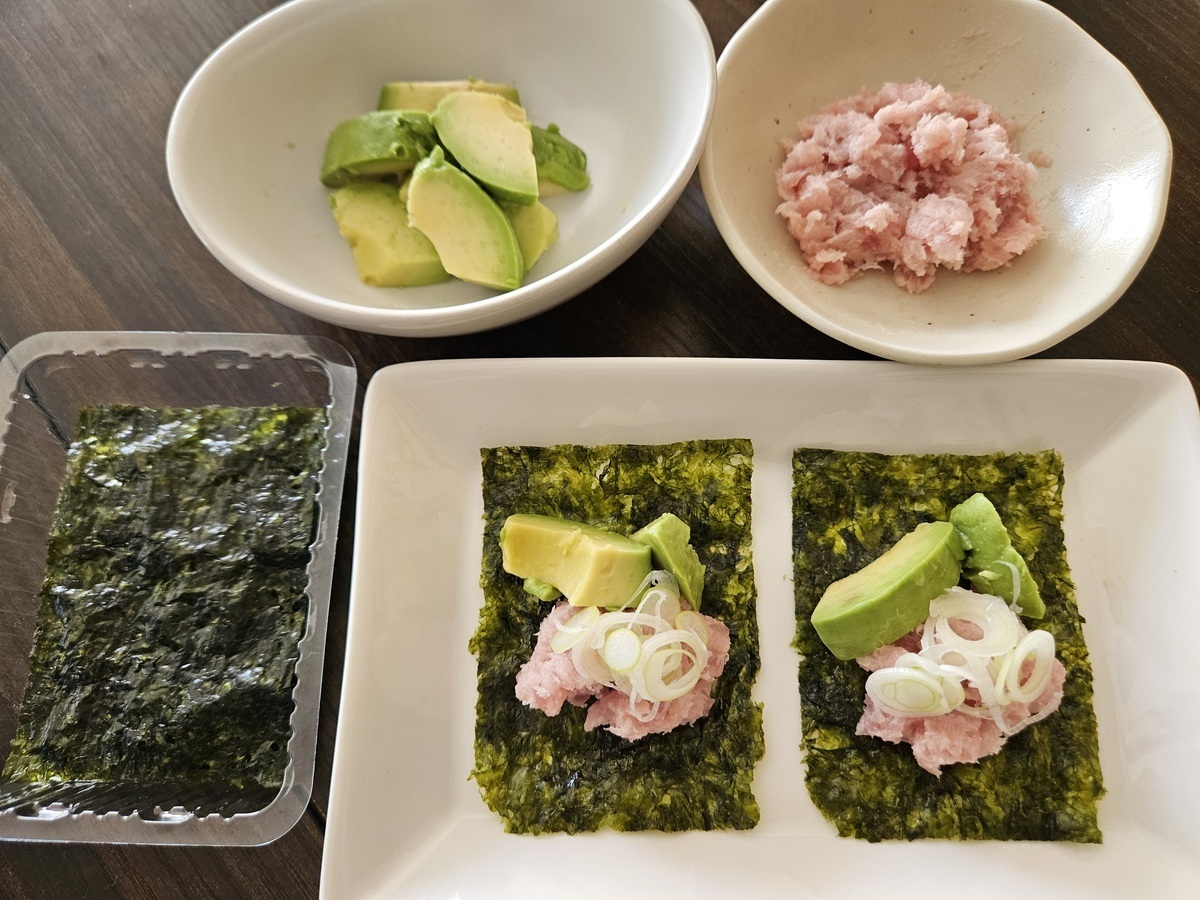 韓国のりの上にカットしたアボカドと、鮪たたきとネギをのせたらしょう油をたらして、くるんでパクっといただきます!