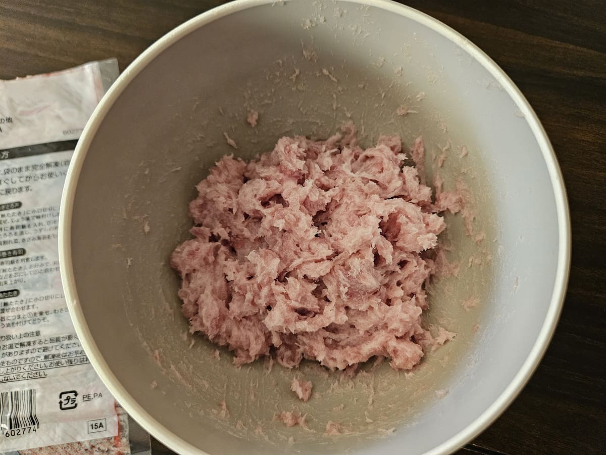 解凍したものを器にすべて出して十分にほぐし、「空気に触れて約30分で鮪の赤い色に戻る」との記載があるので、そのまま30分ほど置いておきました!
