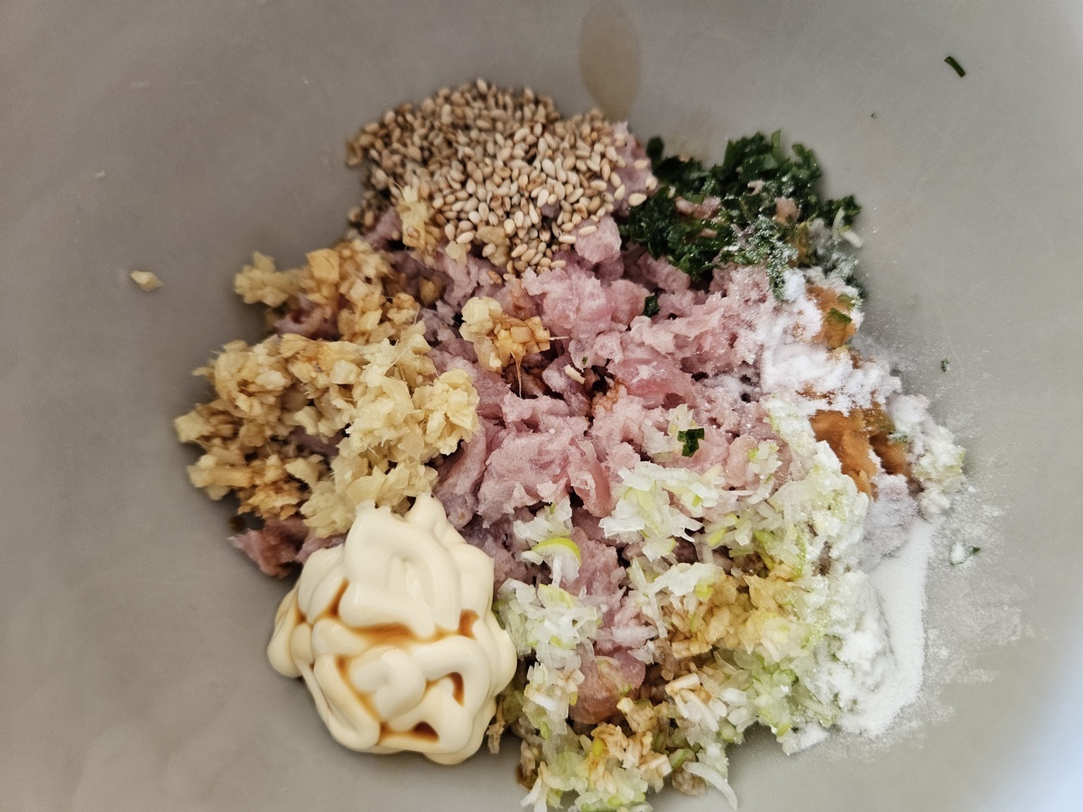 器に鮪たたきとみじん切りにしたネギ、生姜、大葉に、いりごま、マヨネーズ、片栗粉、しょう油を適量入れて混ぜ合わせます。