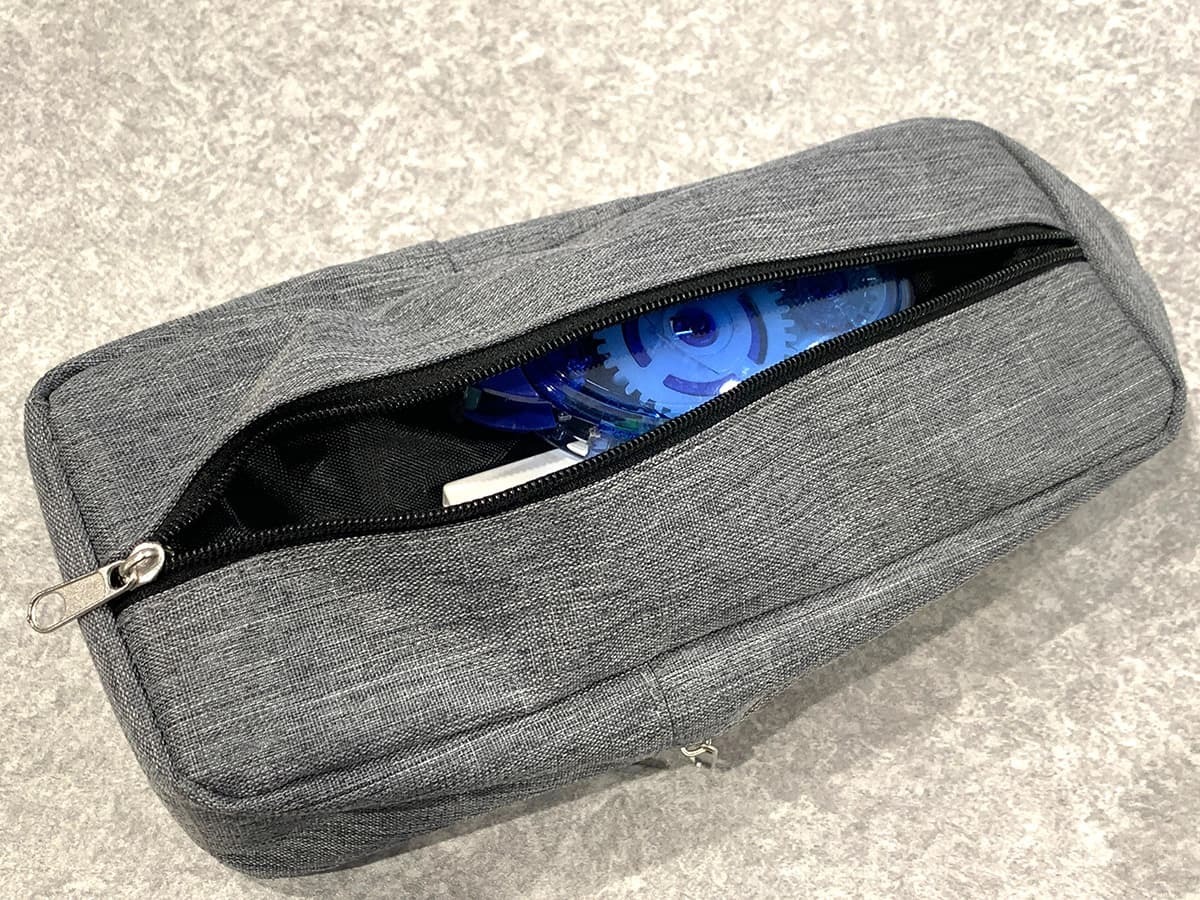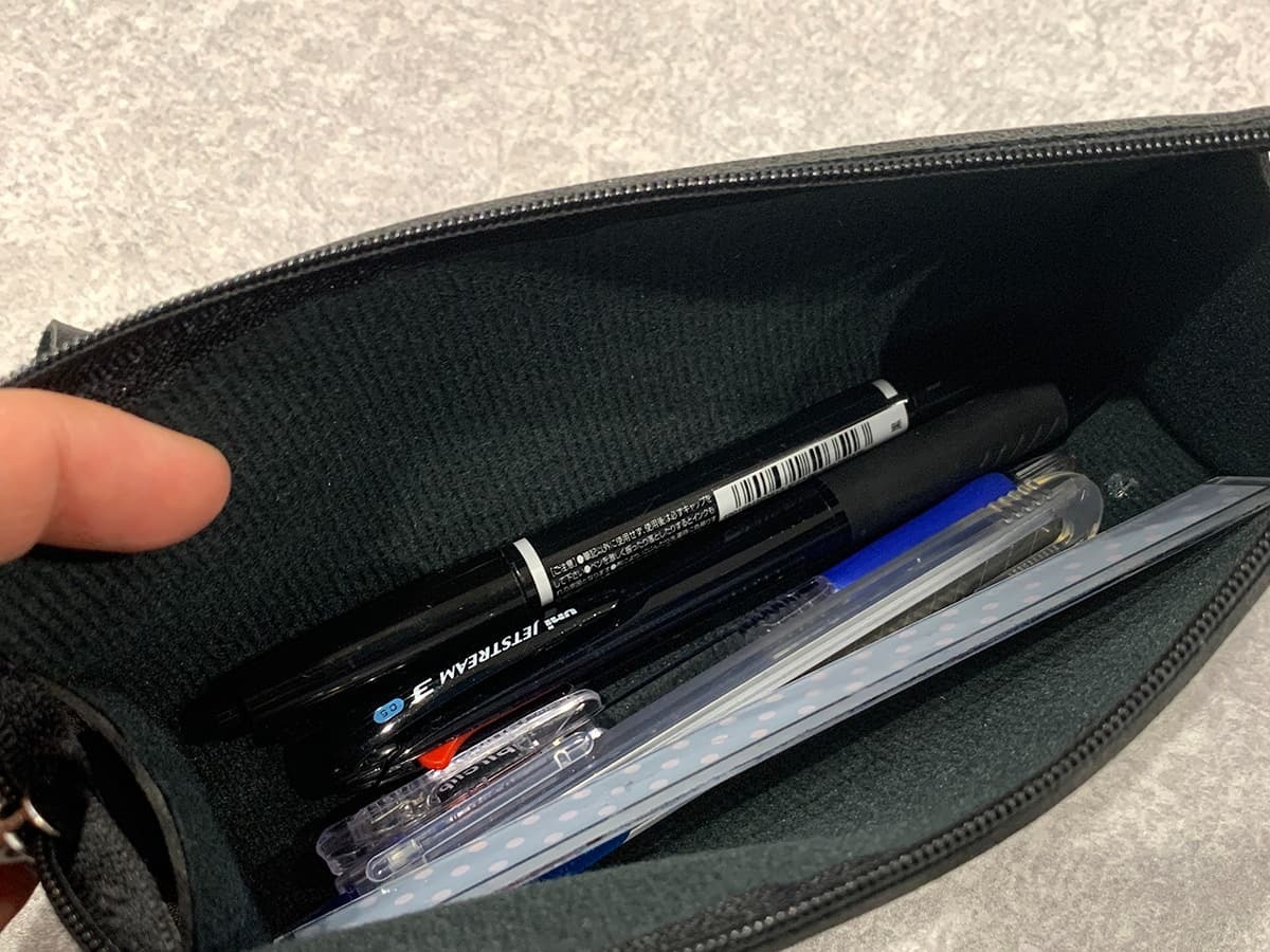 試しにペンやカッターなど文房具を入れてみました。余裕のある大きさで、通常サイズのペンであれば問題なく入ります!