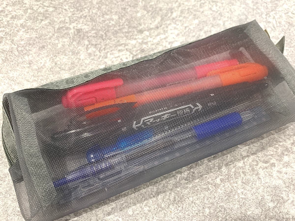 100円ショップらしいシンプルな見た目で、使う人を選ばない「メッシュペンケース(スクエア)」をご紹介します。