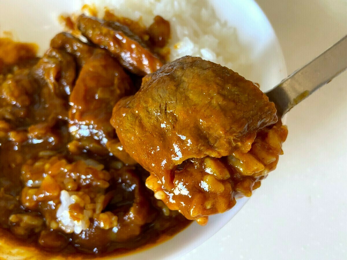 カレー用スプーンからはみ出るほどの国産牛の大きな塊がごろごろ。