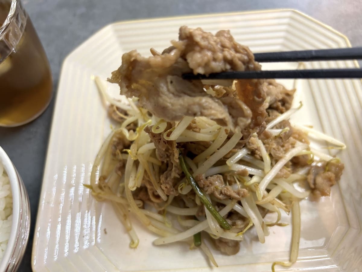 バラ肉は適度な大きさにカットされていて、ニンニクの芽が少々入っていて、食欲を刺激する調味料の香りが漂います。