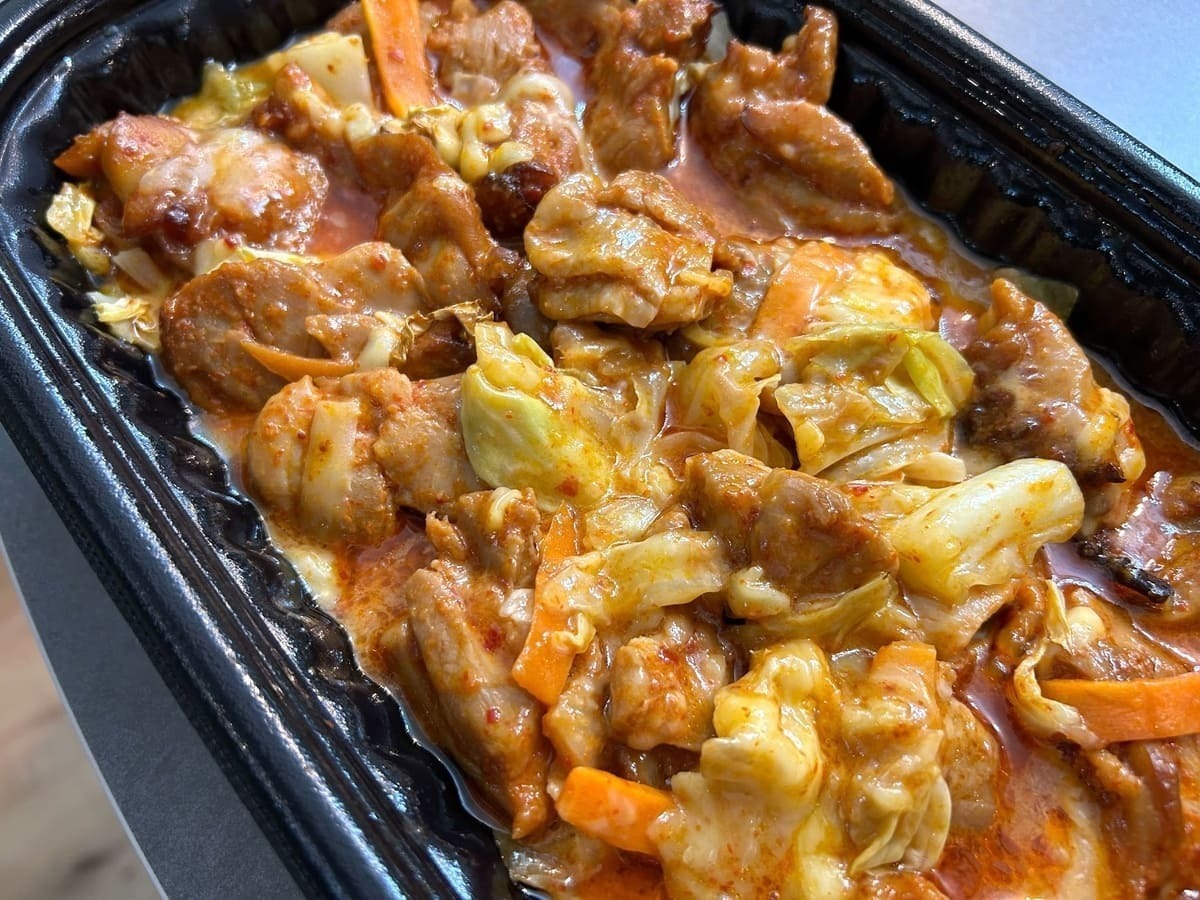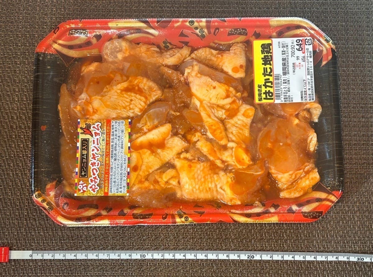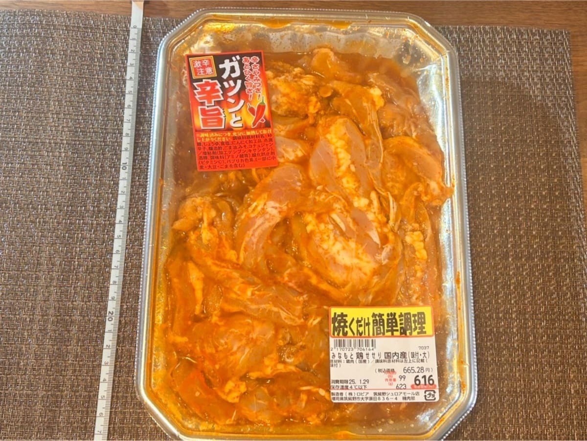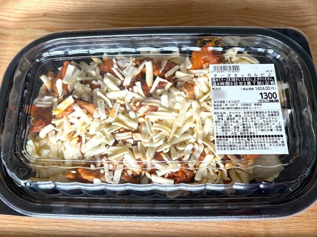 手に取るとずっしり重い「チーズタッカルビ」。家で測ってみたら、なんと1kg超えのすごいボリュームでした。