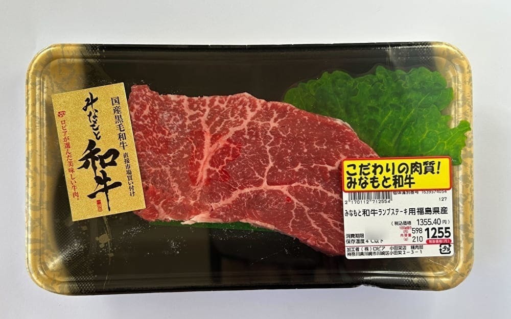 ロピアの牛肉といえば、「みなもと牛」ですが、そのステーキ肉「国産黒毛和牛のみなもと牛のステーキ肉」です。