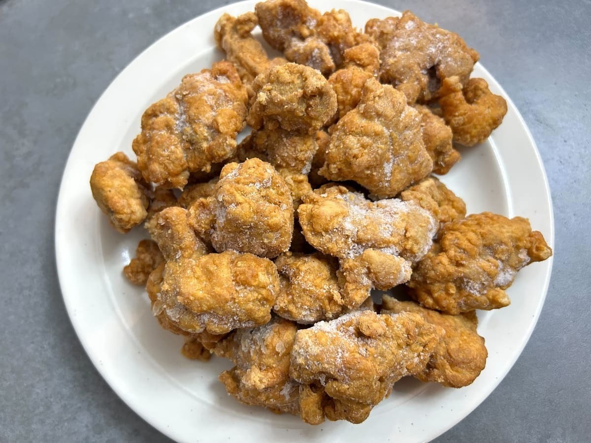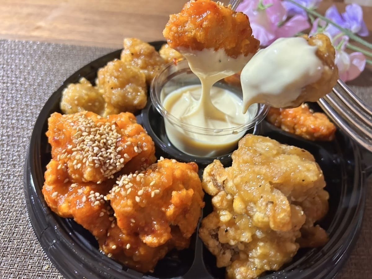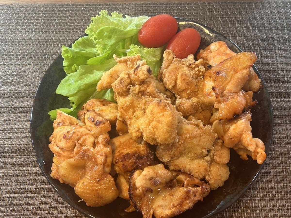 鶏もも肉を使っているので柔らかくとてもジューシー。衣は薄めで、小麦粉系です。衣が薄いので肉のジューシーさが際立ちます。