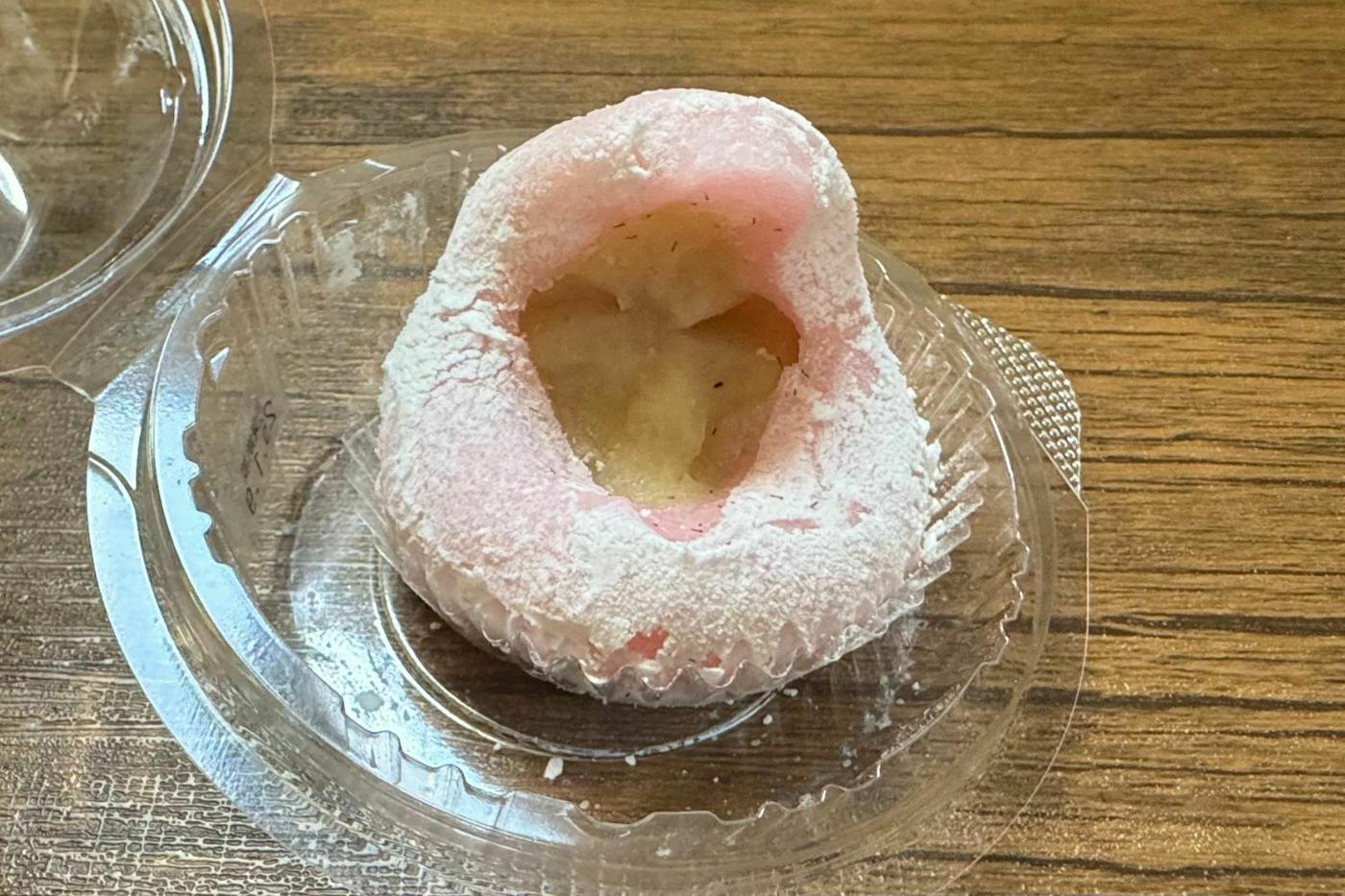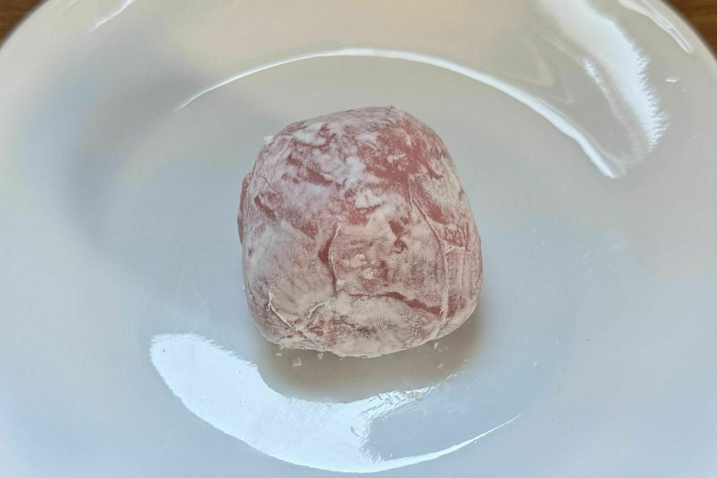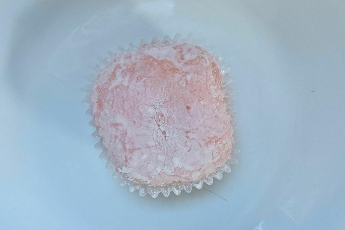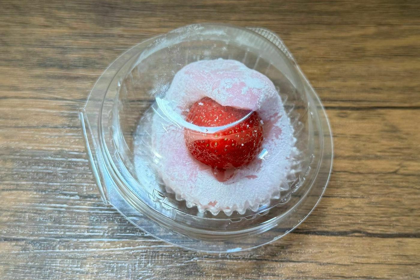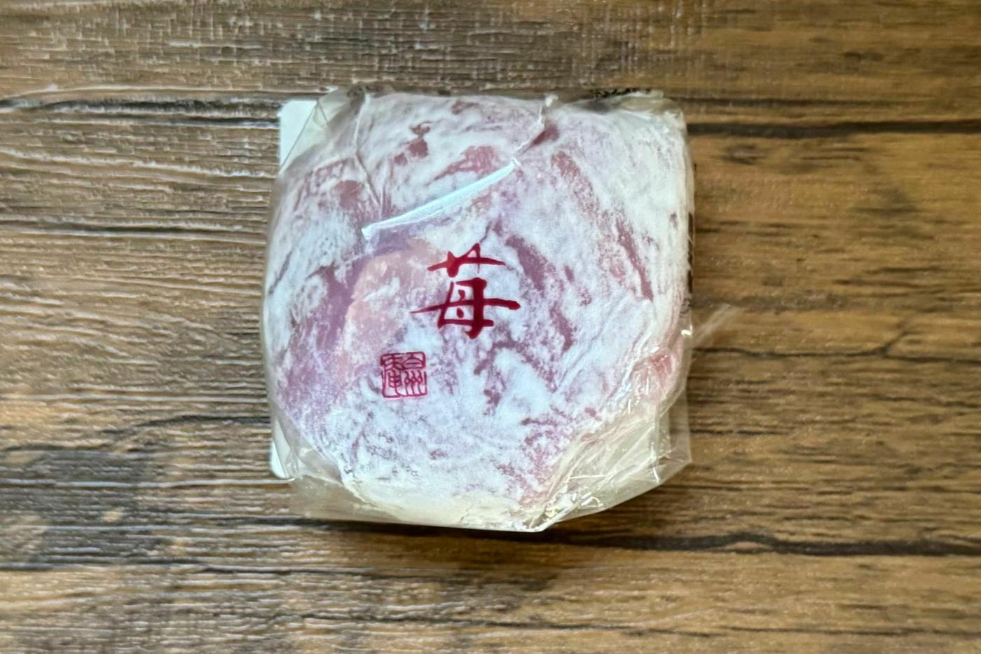 袋から取り出してみると、ピンクの可愛らしい大福がお目見え♪ ふわっと香るいちごの香りが食欲をそそります!