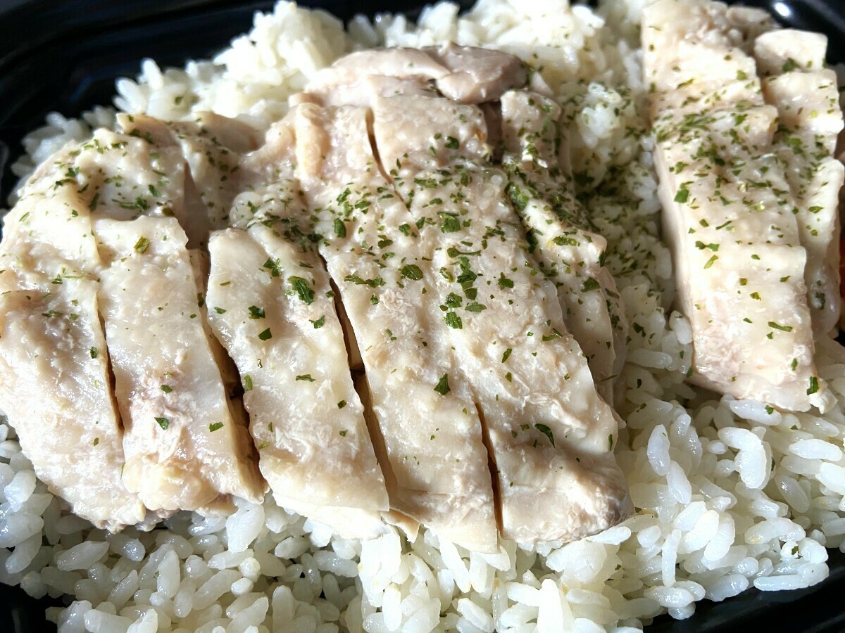 フタを開けると、ご飯の上にゆで鶏がたっぷり敷き詰められていて迫力満点!