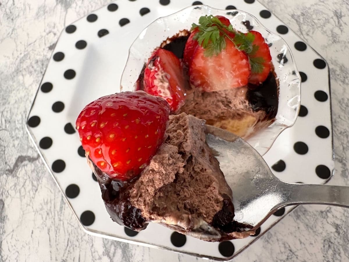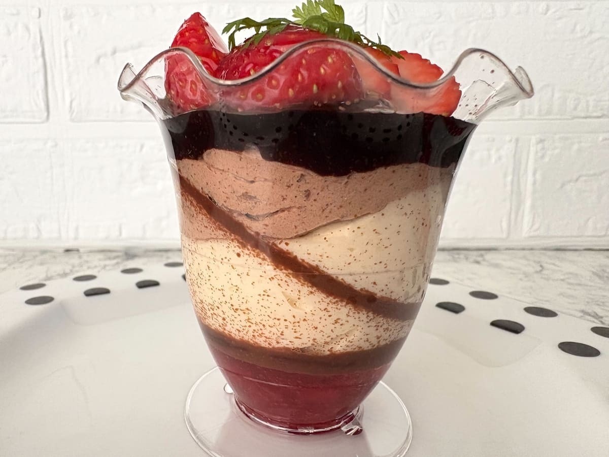 グラスに美しく層を重ねたパフェスタイルのデザートです。ツヤのあるチョコソースが魅力的で、いちごとチョコという間違いない組み合わせを楽しめます。