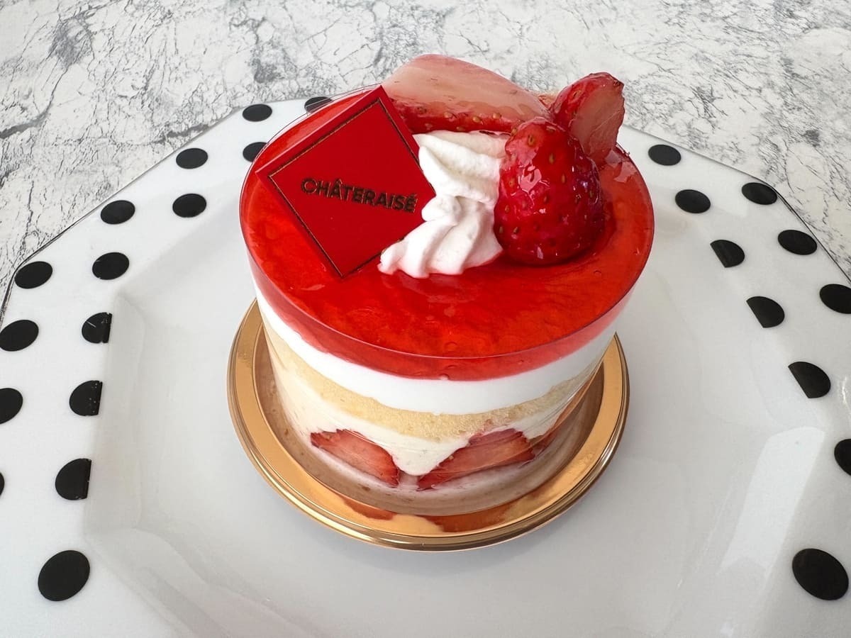 フレッシュないちごと甘酸っぱいいちごの果肉入りソース、カスタード入りホイップクリームをスポンジでサンドし、トッピングにはフレッシュないちごと鮮やかなゼリーをあしらった、見た目も美しいケーキです。