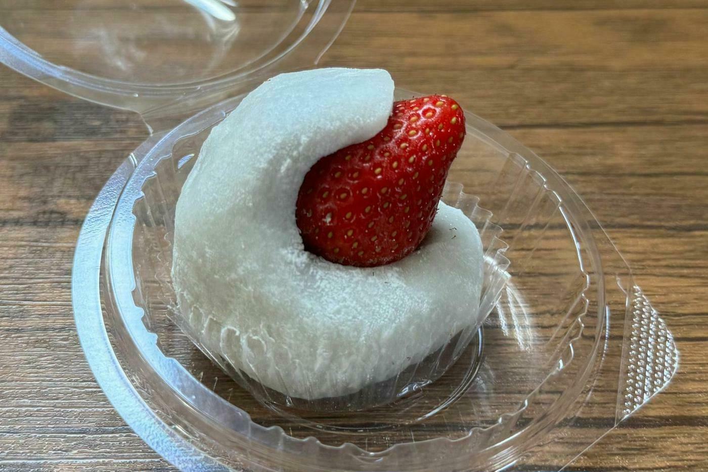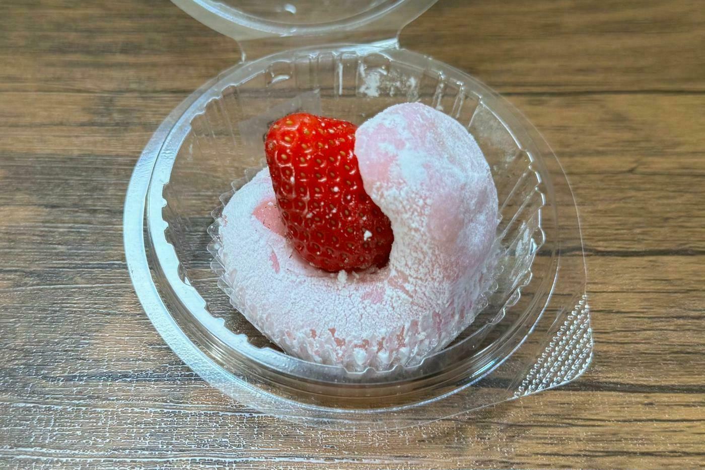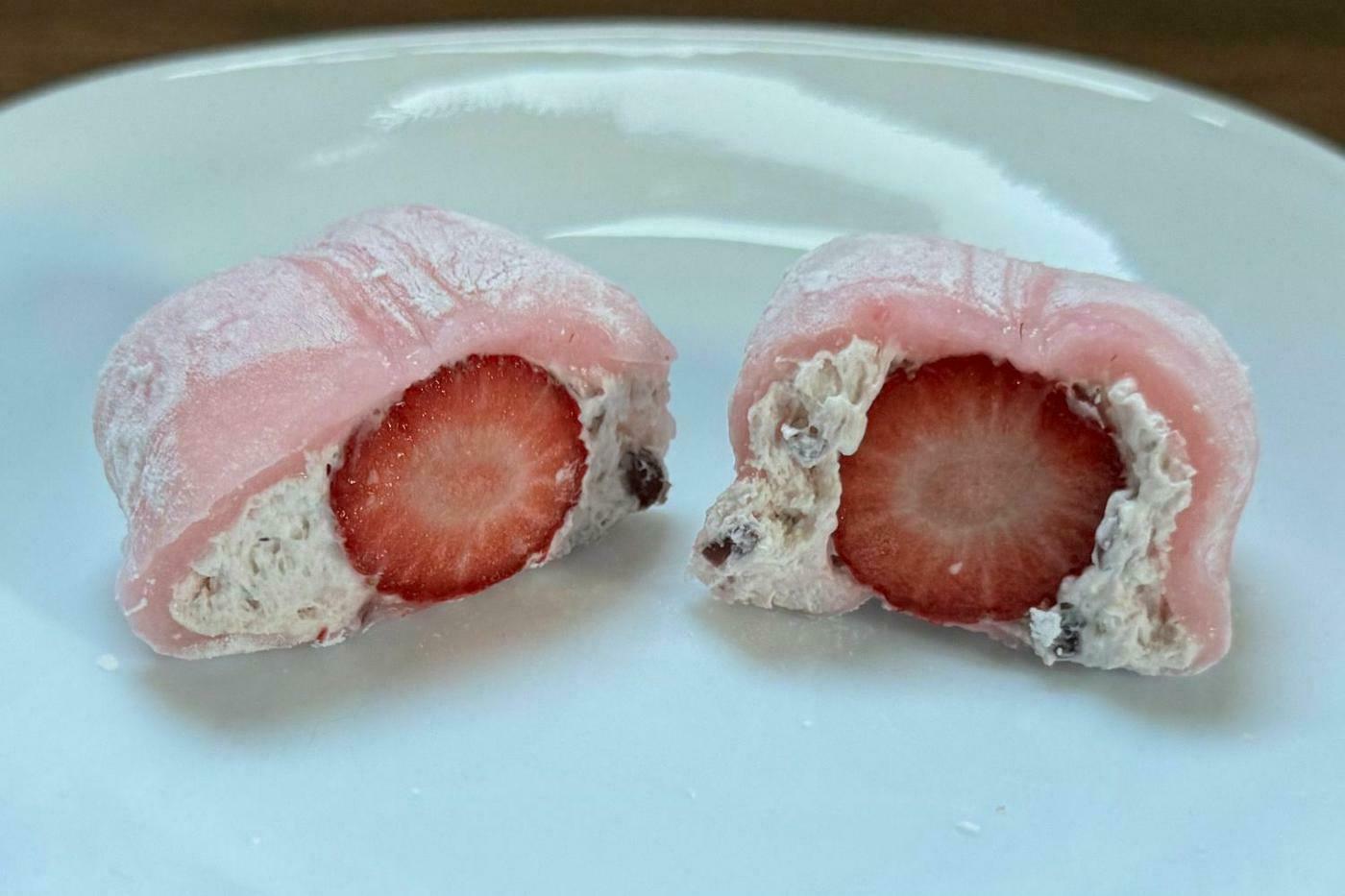 大胆にはみ出た苺の赤色が白い餅生地とのコントラストでよく映えます。