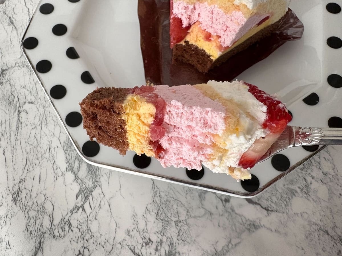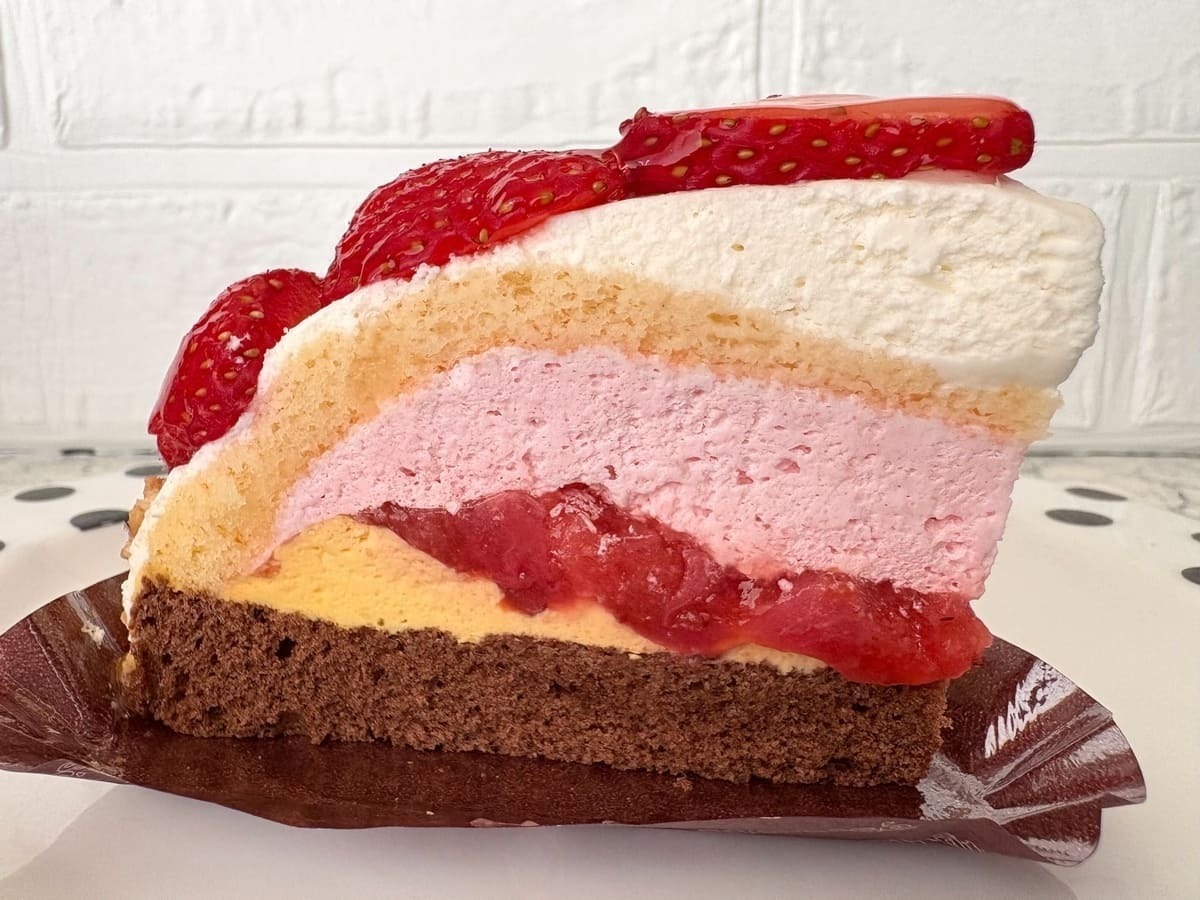 断面は底からチョコレート生地、黄色のみかんクリーム、いちごソース、いちごクリーム、スポンジ、ホイップクリームが美しく重なり、色彩のコントラストが目を引きます。