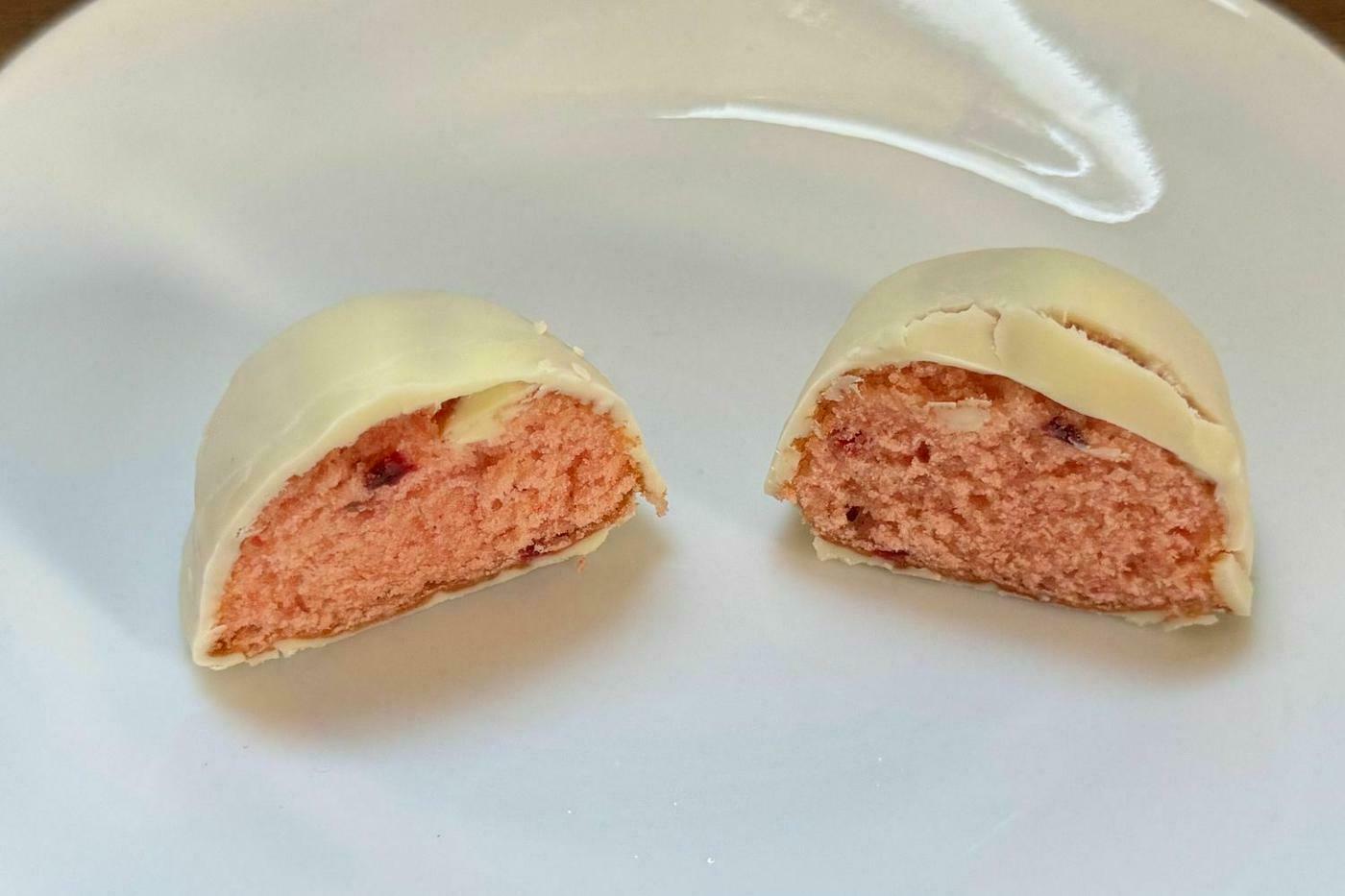 乾燥苺入りの生地をまろやかなホワイトチョコでコーティングし、ミルキーな甘さとほのかな苺の酸味が楽しめる一品に仕上げています。