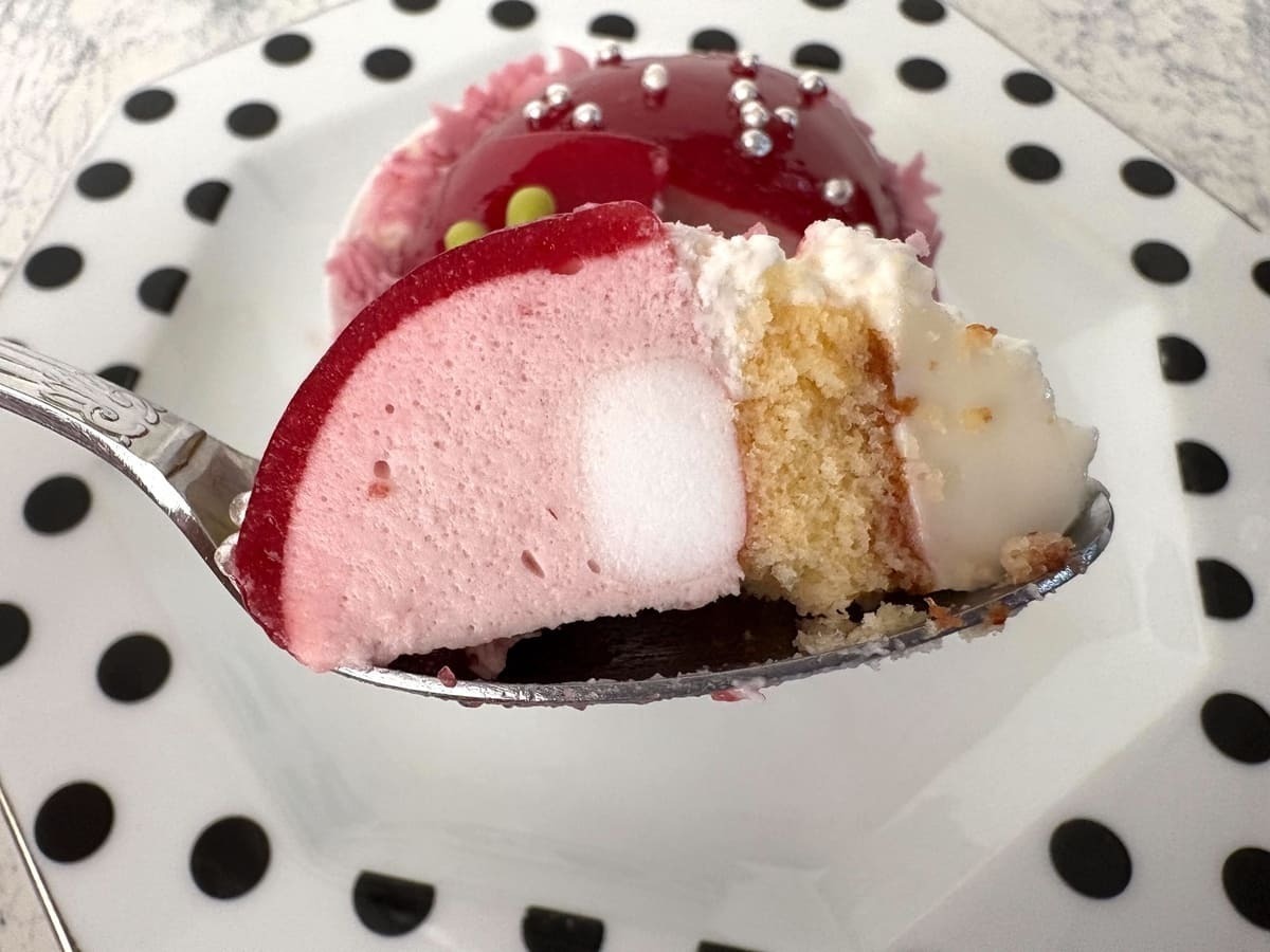 上部のいちごナパージュは濃厚な味わいで、中のいちごムースは飲み物のイチゴミルクを思わせるやさしい風味となっており、その中には白い四角いマシュマロが入っているという面白い組み合わせです。