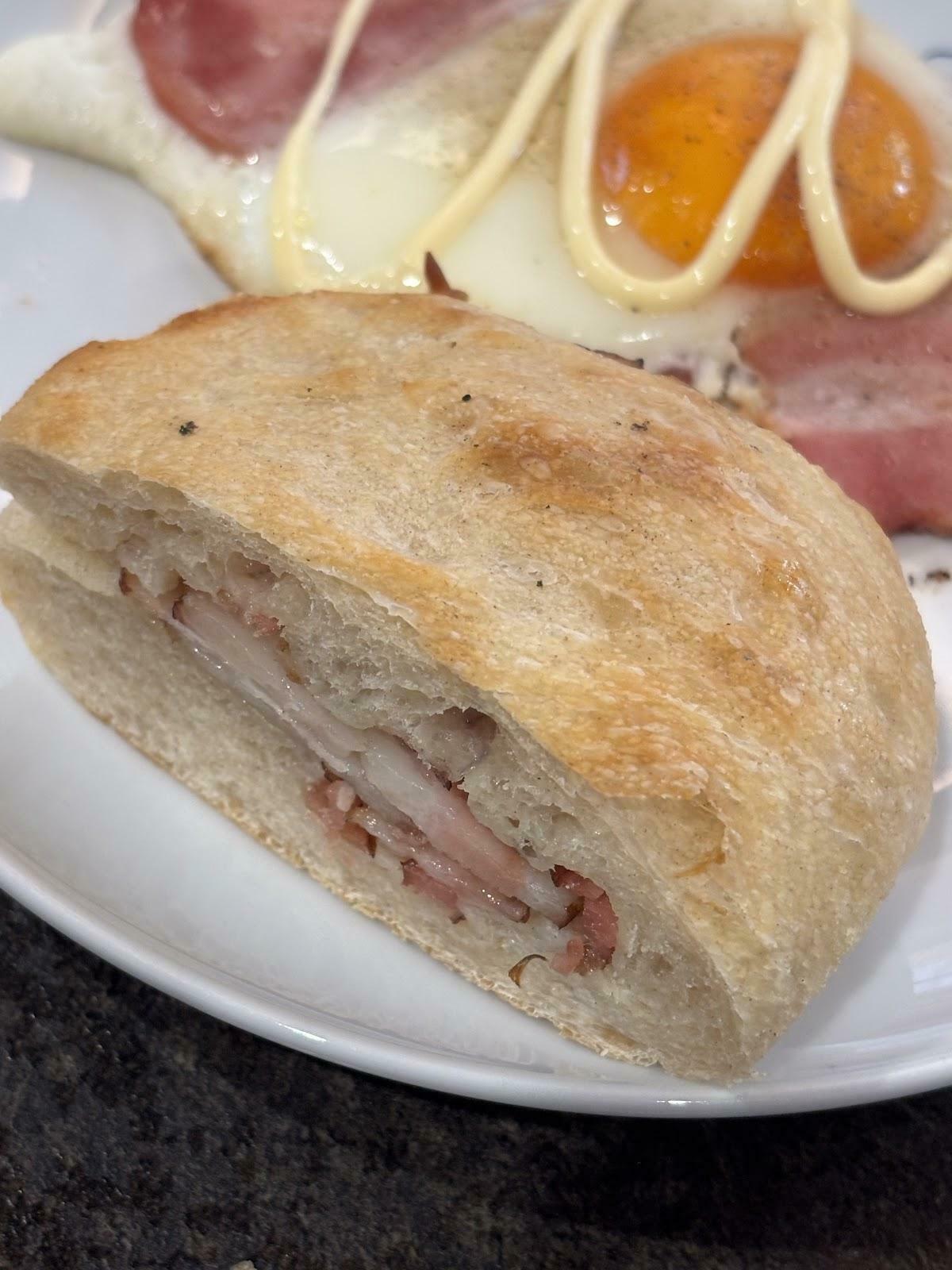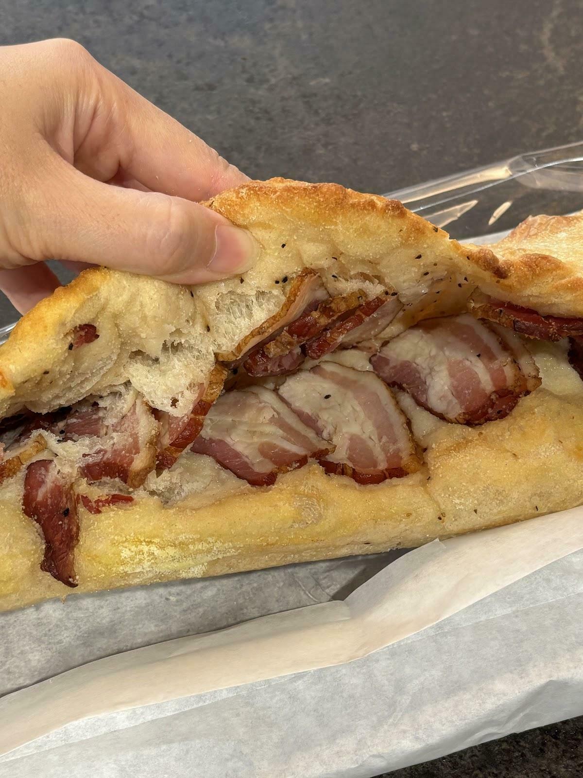 切り口を見て驚いたのですが、端から端までベーコンがぎっちり!何重にも重なって敷き詰められていて、どこを食べてもベーコンの旨味が楽しめます。これは、ベーコン好きにはたまらないご褒美パンです!