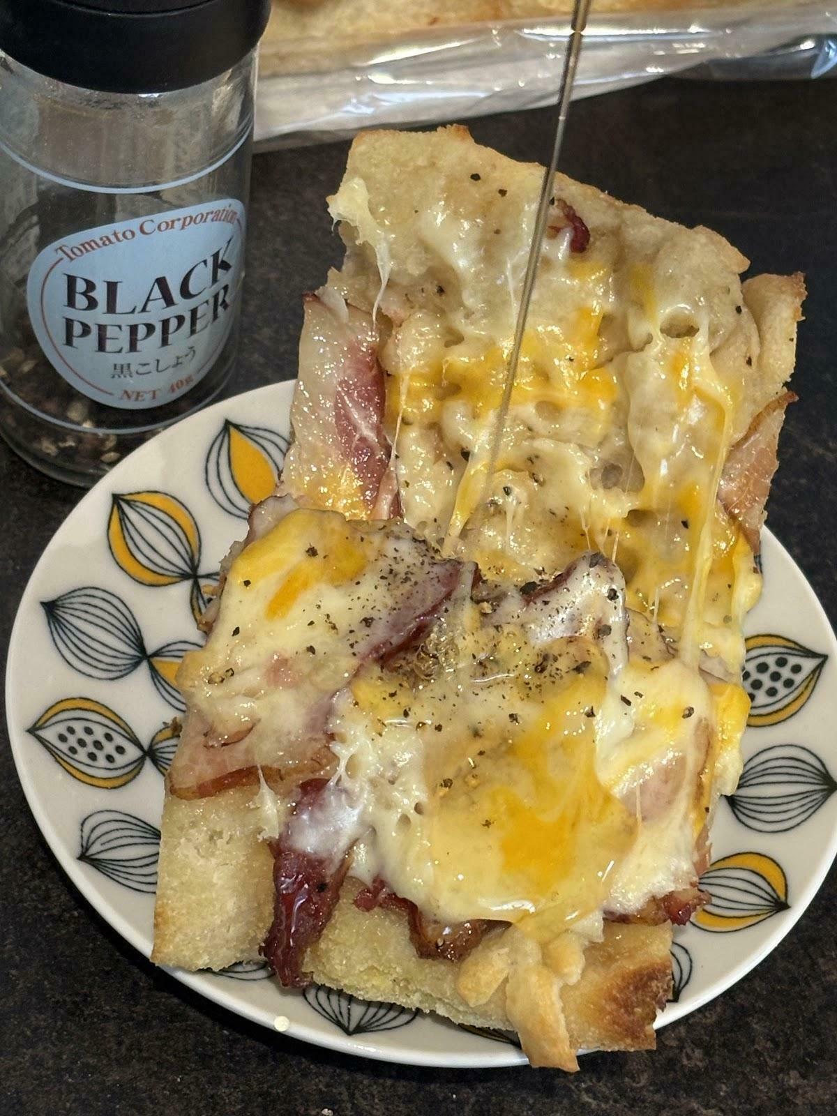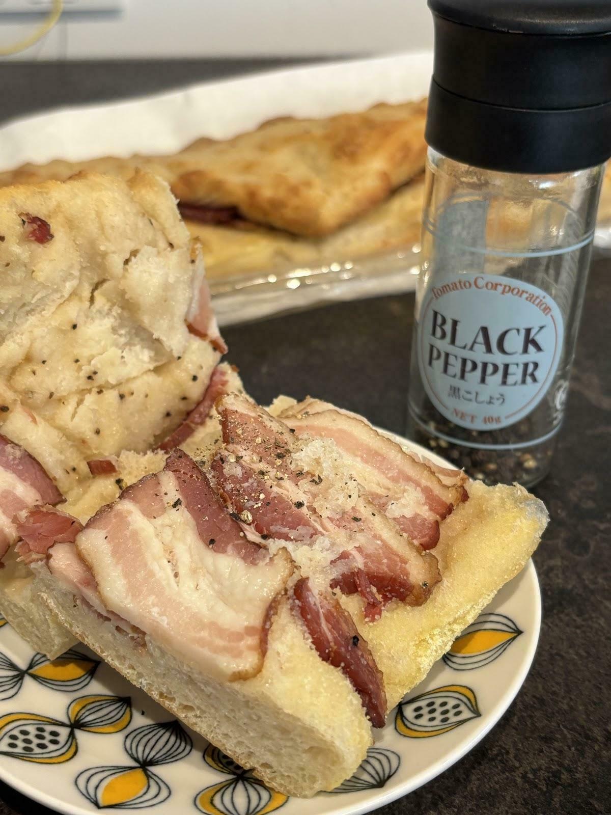 粒系ブラックペッパーをたっぷりON!シンプルながら、これがベーコンの旨味を格段に引き上げる魔法の一手!ぜひ試して!