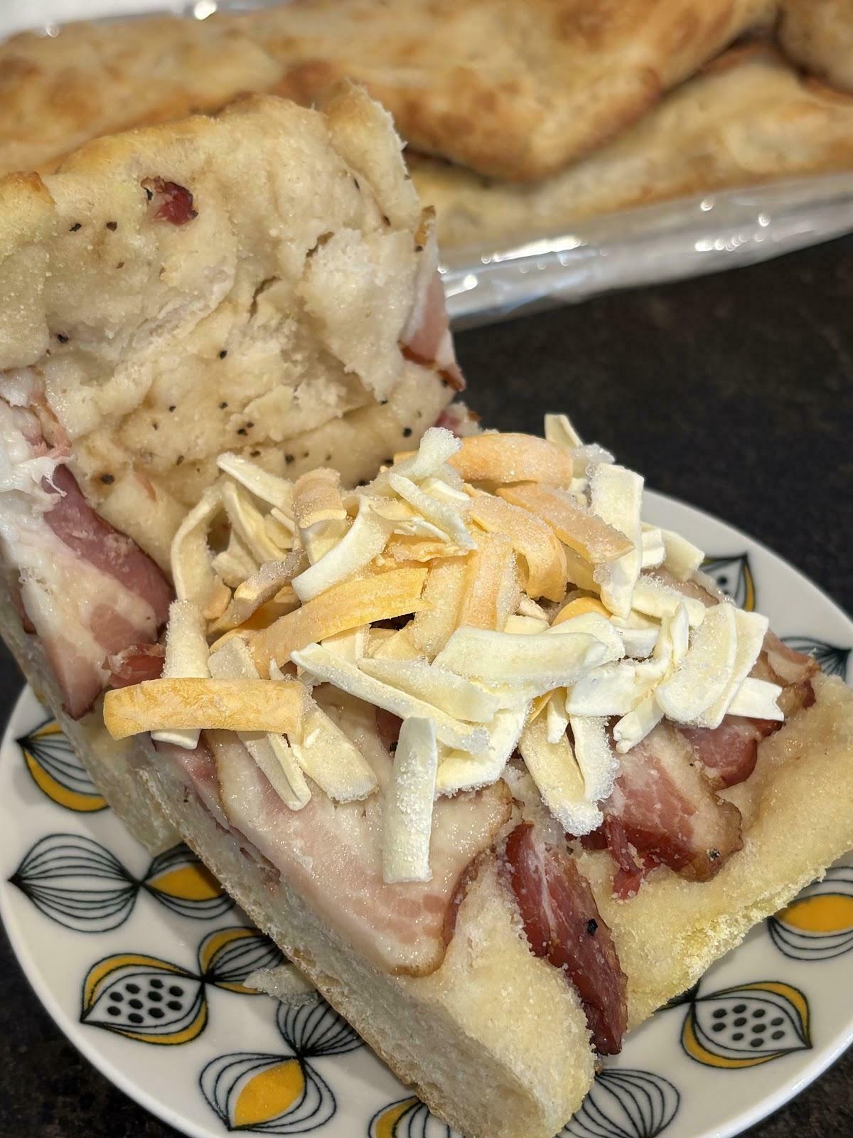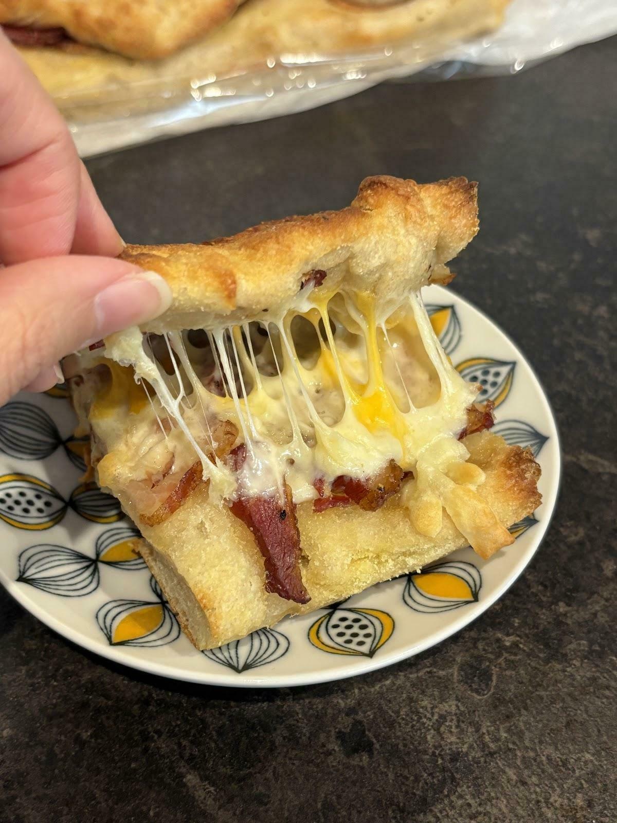 カリふわ派:オーブンで焼き直すと、外はカリッ、中はふわっとした感動の食感に!温めることで、ベーコンの燻製香と旨味がパン全体に染み渡って、美味しさが倍増します。