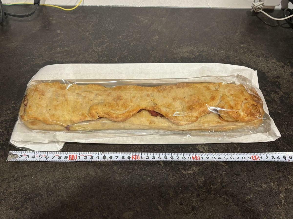 買い物カートに入れた瞬間、思わず二度見してしまうほどの圧倒的な存在感。なんと全長約42cm、重さ520gという、まるで武器のような(!?)ビッグサイズなんです。これがたった899円(税込)で買えるなんて、さすがコストコ!溢れ出すベーコンと自家製チャバタの感動的な出会い。