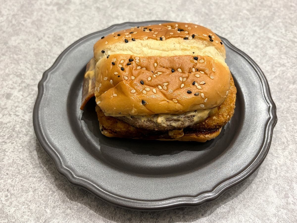 ゴマが練り込まれたバンズに100%ビーフパティ、ポテトパティ、コンソメペッパーマヨ、スモークベーコンを挟み込んだ「ザク切りポテト&肉厚ビーフ やみつきコンソメペッパーマヨ」をご紹介します。