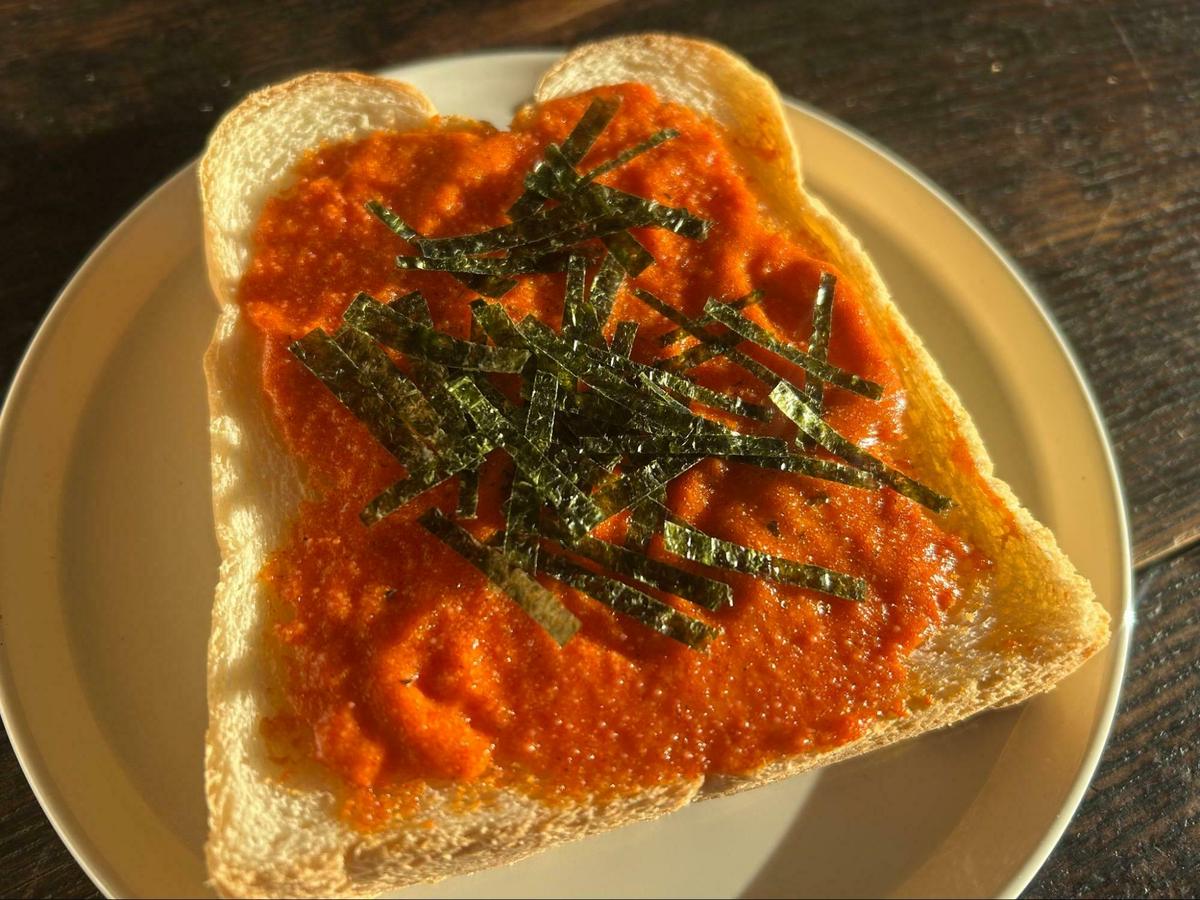 マヨネーズを多めに明太子を混ぜ、食パンに塗って焼くと、香ばしさが加わって少しマイルドに。刻み海苔と相性ばっちり!かなりおいしかったです。が、朝に食べるものではないかもしれません(笑)