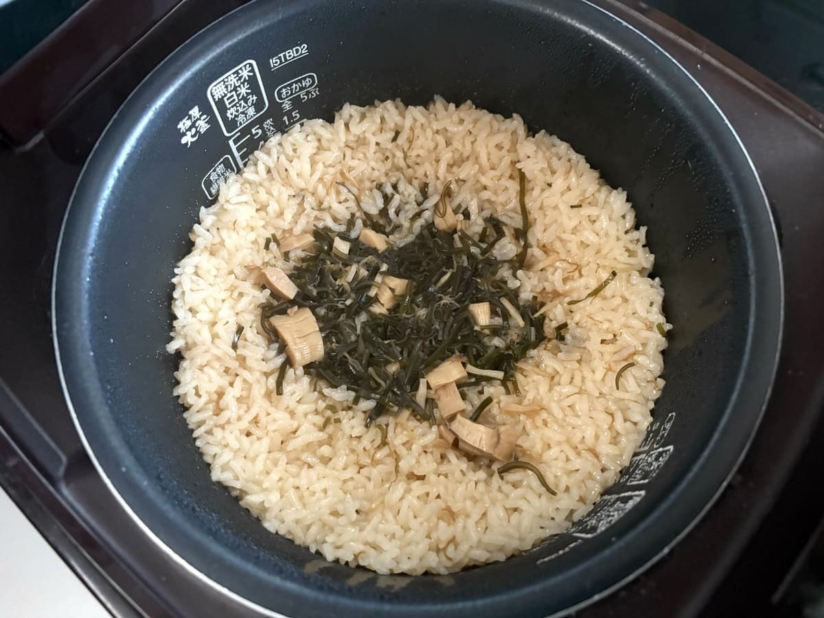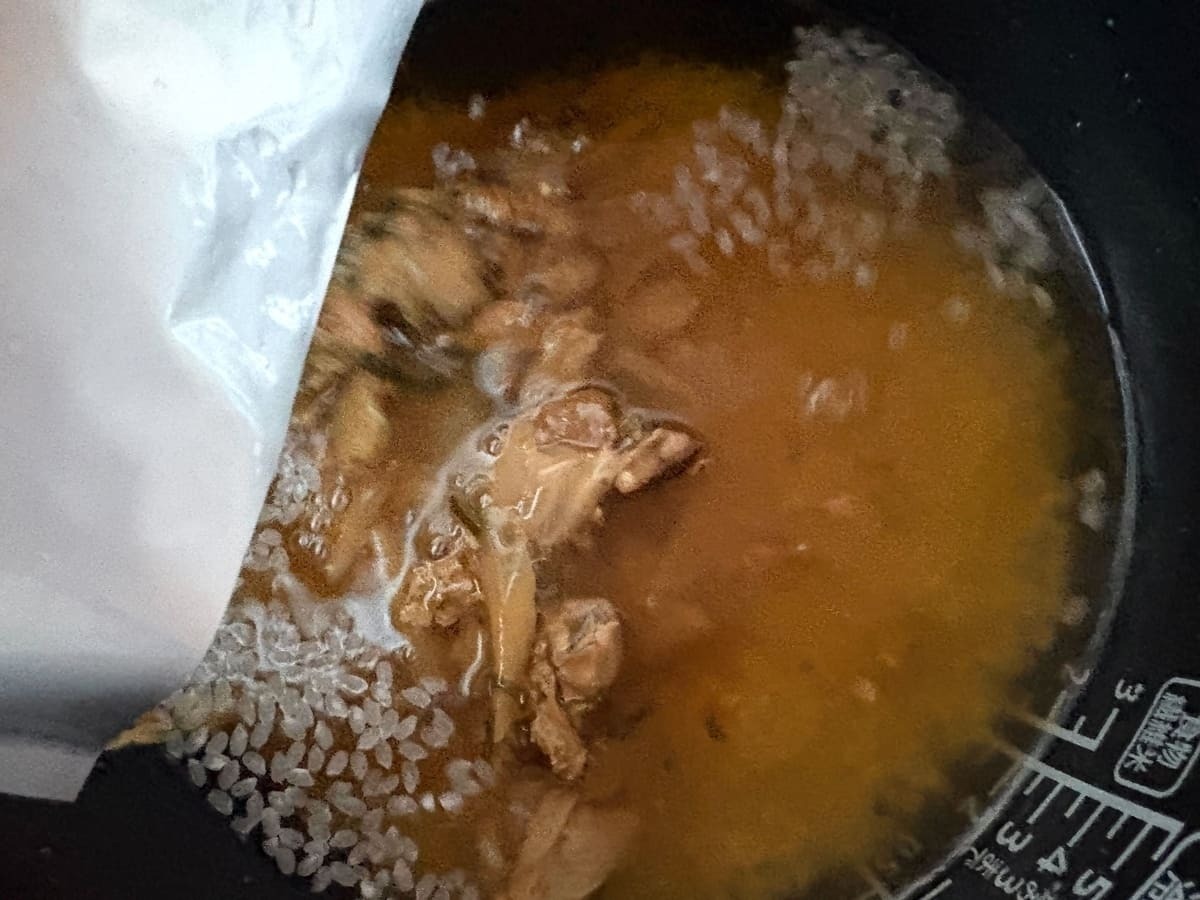 お米を軽くすすぎ、米と規定量の水、具材を入れて炊くだけ。