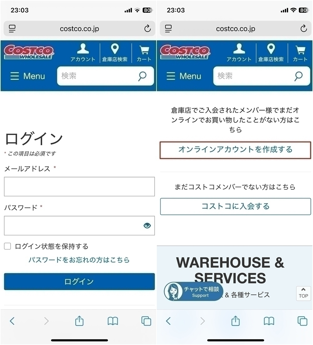 登録手順ですが、まずコストコのメルマガ登録ページへ遷移し、「ログイン / オンラインアカウント作成」をタップします。