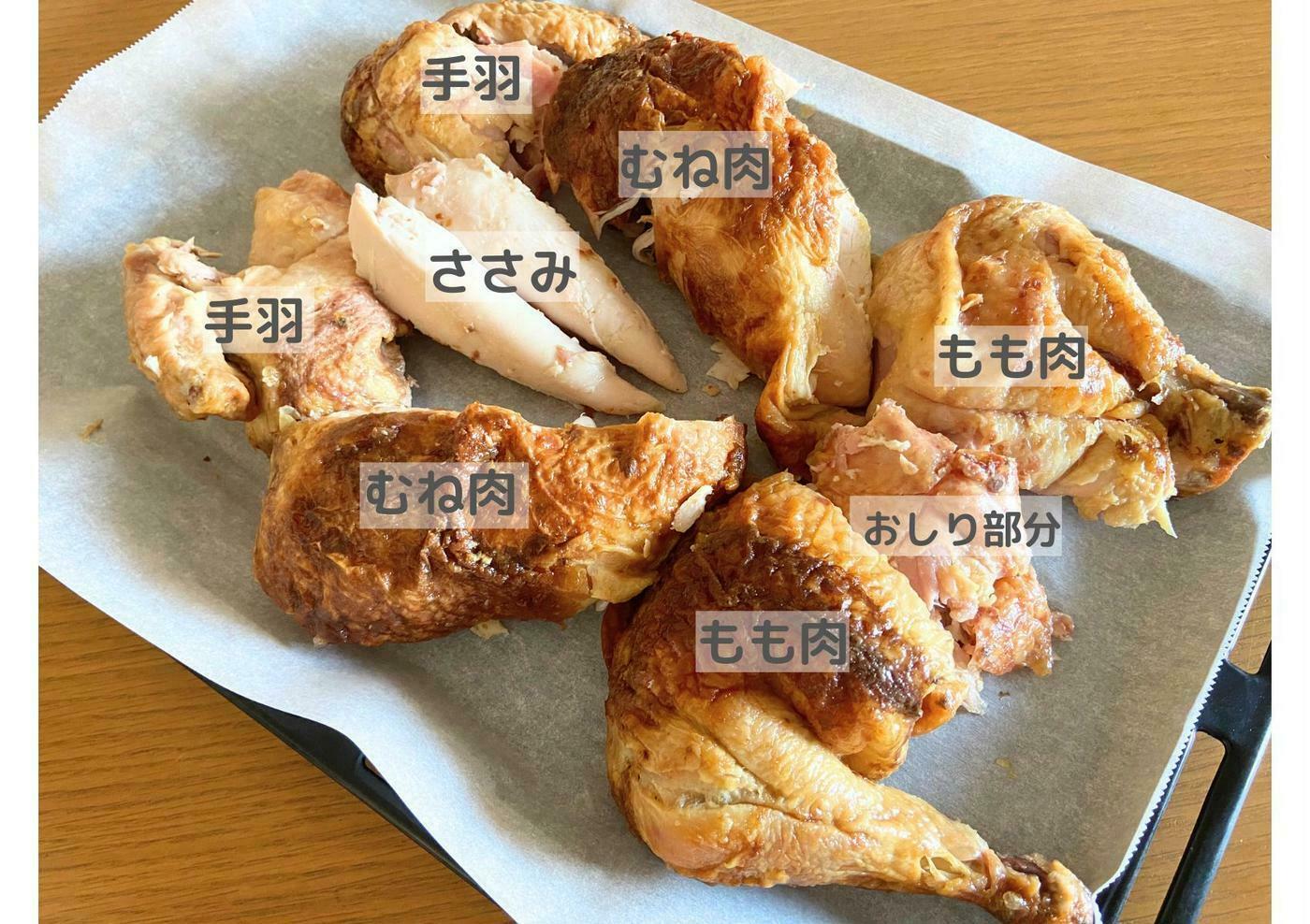 もも肉は柔らかく子供に人気で、手羽やむね肉はスライスしておつまみに適しています。冷めた場合は電子レンジ(500W)で5~8分温め、仕上げにオーブン(250℃)で5分焼くと皮がパリッとなります。