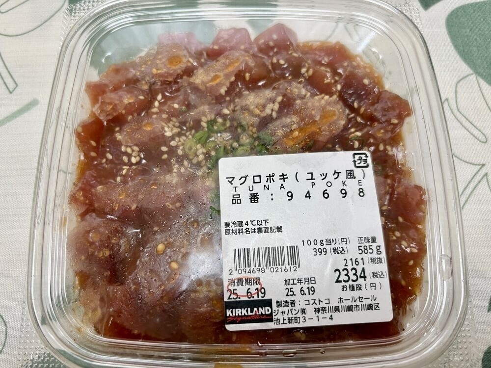 コストコのデリカコーナーにある「マグロポキ(ユッキ風)」は、定番のサーモンポキと並んで販売されている商品です。