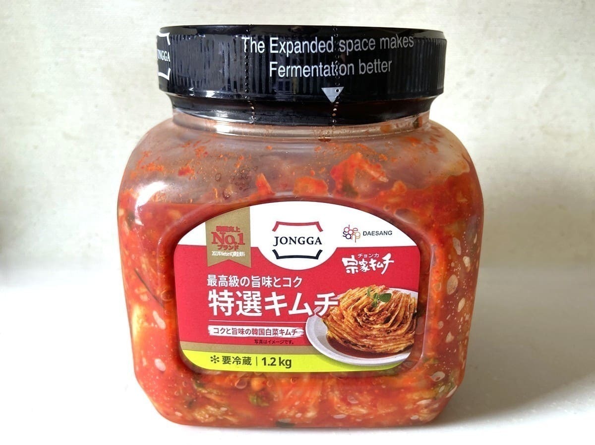 パッケージのリニューアルを経ても長く愛されているロングセラー商品で、一般的なスーパーでは見かけない巨大なボトルに1.2kgもの白菜キムチが入っています。