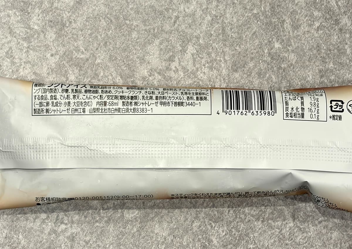 価格は1本86円(税込)と、シャトレーゼらしい安さ!カロリーは162kcalとなっており、アイスバーとしては平均的な数値です。