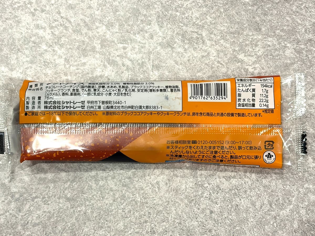 ビターキャラメルアイスにブラックココアクッキーを混ぜ込み、さらにクッキークランチを散りばめたスイートチョコでコーティングしたアイスバー。価格は97円(税込)で、カロリーは194kcalです。
