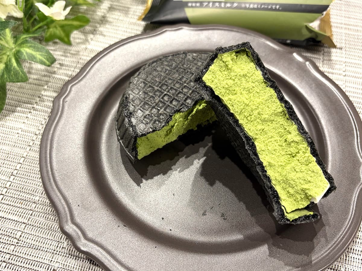 半分に割ってみると、中から深い緑色の宇治抹茶アイスが!黒×緑のコントラストが美しく、高級感のある和モダンな雰囲気を醸し出していますね!