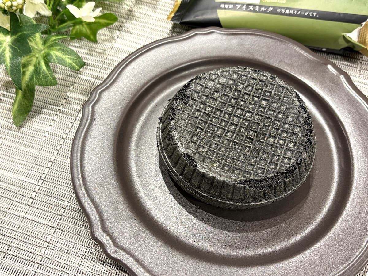 袋の中には、真っ黒なモナカ皮のアイスが入っていました。非常にインパクトのあるビジュアルに加え、抹茶の濃い香りも漂ってきて期待が一気に高まります♪