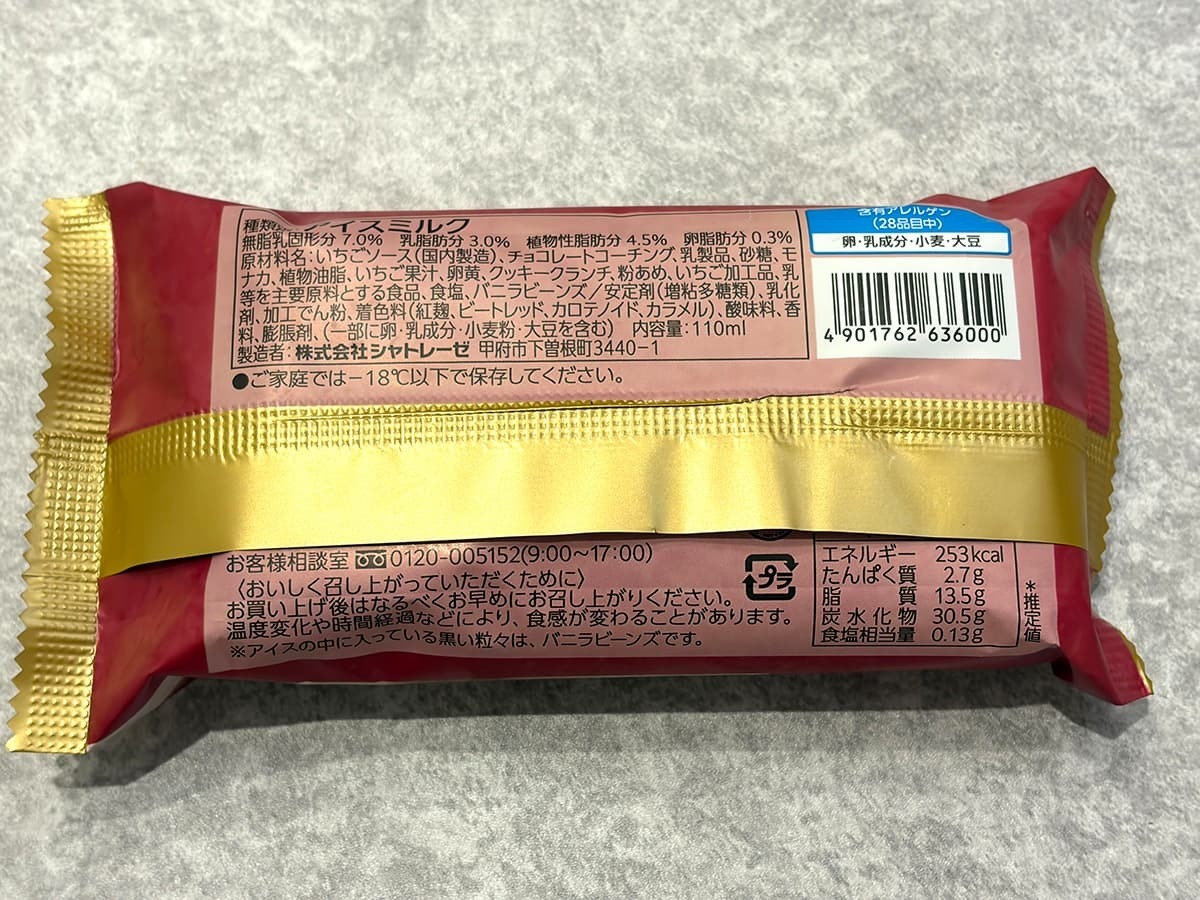 パッケージデザインから高級感が漂ってくるアイス。価格は162円(税込)で、カロリーは253kcalとなっています。