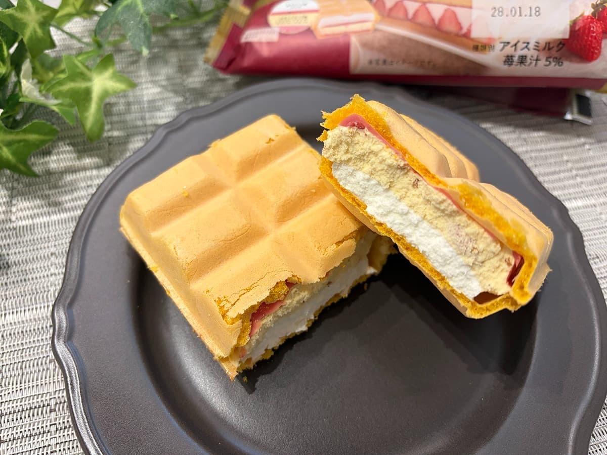 また、モナカ皮に密着している苺チョコにはフリーズドライを混ぜ込んでいるとのこと!パリッとした食感もあり、モナカのサクサク感、苺チョコのパリッと感、アイスのなめらか感と食感の変化を楽しめます!