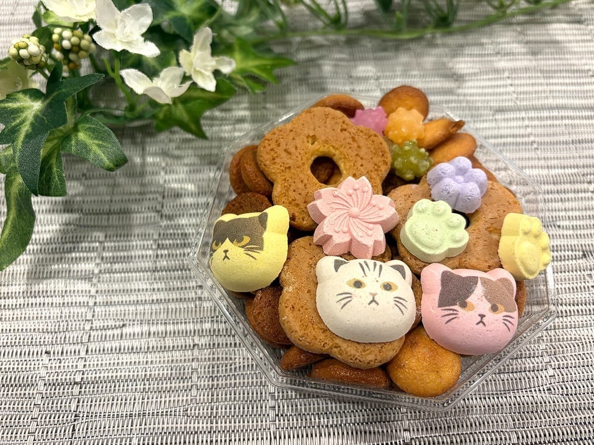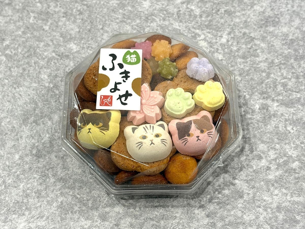 干菓子で表現された猫の顔や肉球が非常に可愛らしい一品です。パックの中には干菓子、金平糖、クッキーが隙間なく詰められており、価格は615円(税込)です。