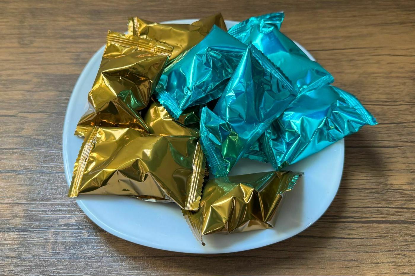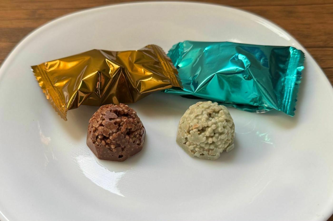 缶の内部にはボールチョコが5粒収められていました。個包装は金、赤、緑といったカラフルな色使いで、華やかな外観です。
