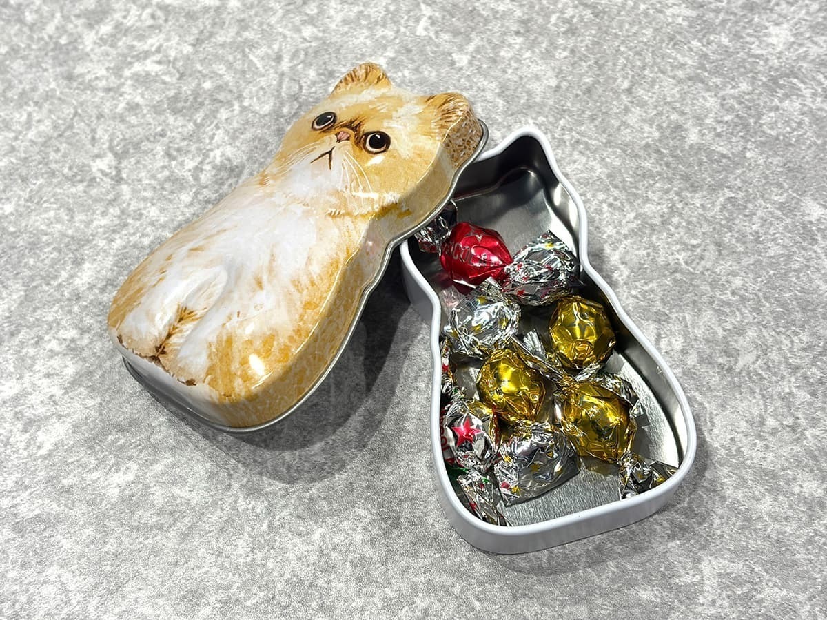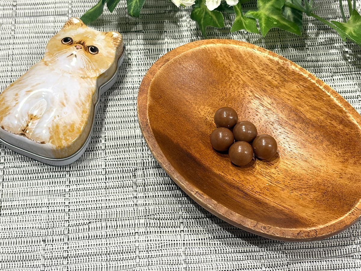 手のひらサイズで愛らしい猫のデザインが特徴の「ミニねこ缶 ボールチョコ」を紹介します。