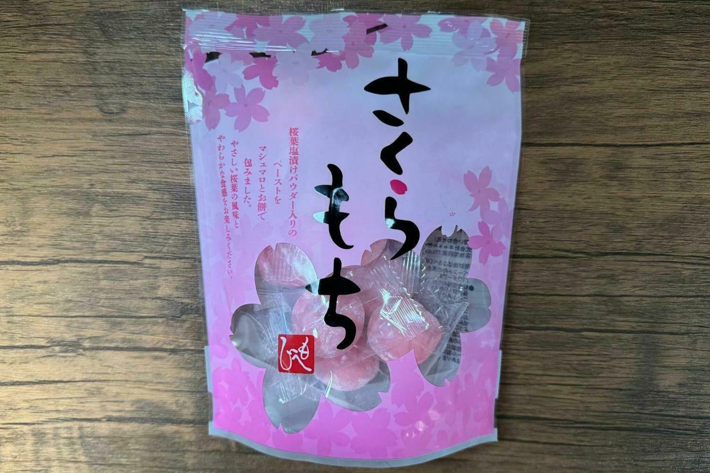 鮮やかなピンク色のパッケージが印象的な、新作のさくらもちです。 桜葉塩漬けパウダーを配合したペーストを、マシュマロとお餅で包み込んでいます。