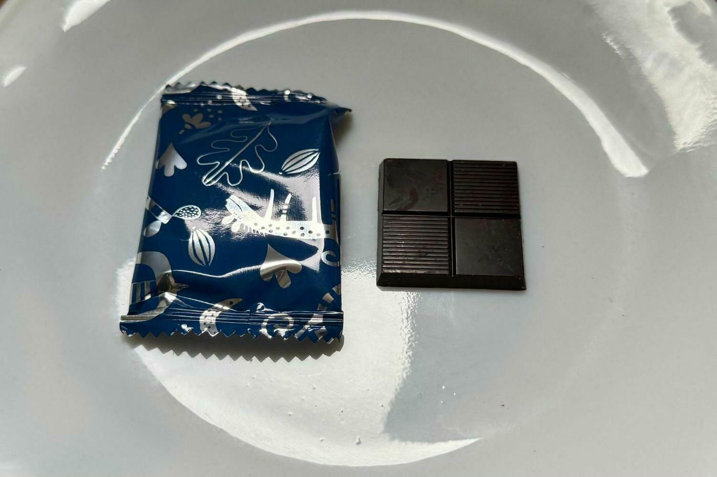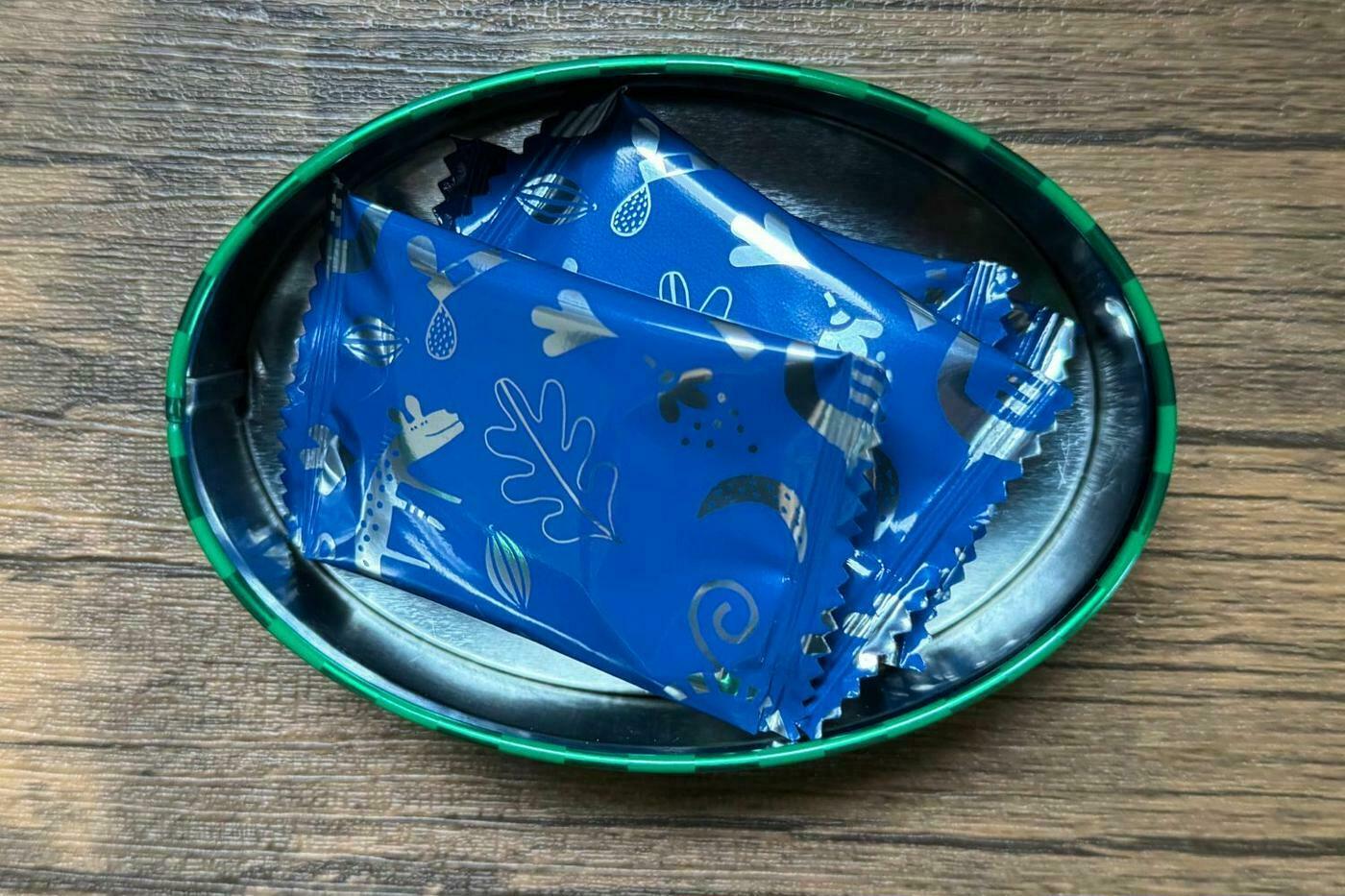 缶の中には、青いパッケージで個包装された一口サイズのチョコレートが4枚入っています。